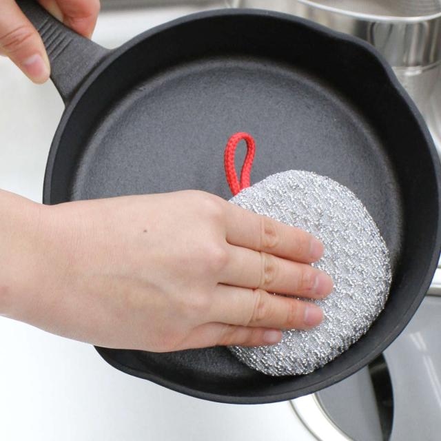 水だけでも汚れをしっかり落とせる便利さが魅力です。キッチンでちょっと焦げついたな、という場面でも取り回しがよく、洗剤が使えないスキレットのお手入れにも活躍します。