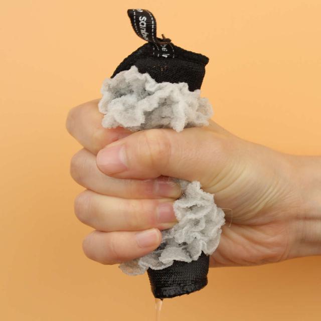 フリルがたっぷり泡立ちを生み、裏面のメッシュ生地が汚れをすっきりキャッチ。水切れがよく乾きが早いので、いつでも衛生的に使えます。