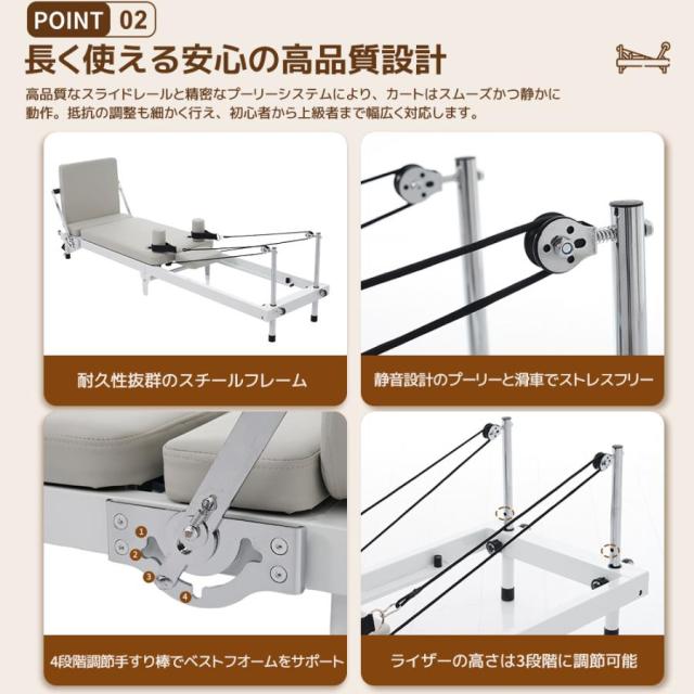 【長く使える安心の高品質設計】高品質なスライドレールと精密なプーリーシステムにより、カートはスムーズかつ静かに動作。抵抗の調整も細かく行え、初心者から上級者まで幅広く対応します。 耐久性抜群のスチールフレーム 静音設計のプーリーと滑車でストレスフリー 4段階調節手すり棒でベストフオームをサポート ライザーの高さは3段階に調節可能