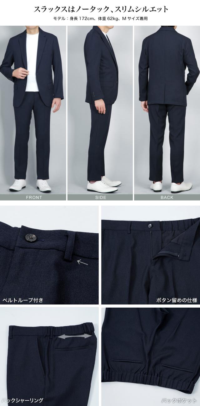 | ▼ジャケット ・シングル2つボタン ・フラップポケット ・肩パット無し ・背抜き仕立て ・袖3つボタン ・センターベント ▼パンツ ・ノータック ・テーパード ・ベルトループ有り ・ウエストシャーリングゴム ・フロントボタン留め ・ジャケット、パンツともにストレッチ生地使用 |
