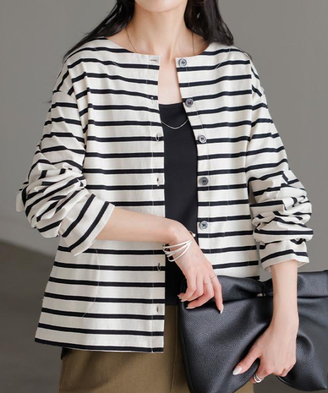 2026SS新作 カーディガン 綿100 配色 レディース トップス カーデ バスク生地 コットン 長袖 クルーネック ボーダー 柄 バイカラー ロンT ジャスト丈 羽織り アウター ライトアウター ゆったり 体型カバー シンプル おしゃれ カジュアル 黒 白 春 夏 HUG.U