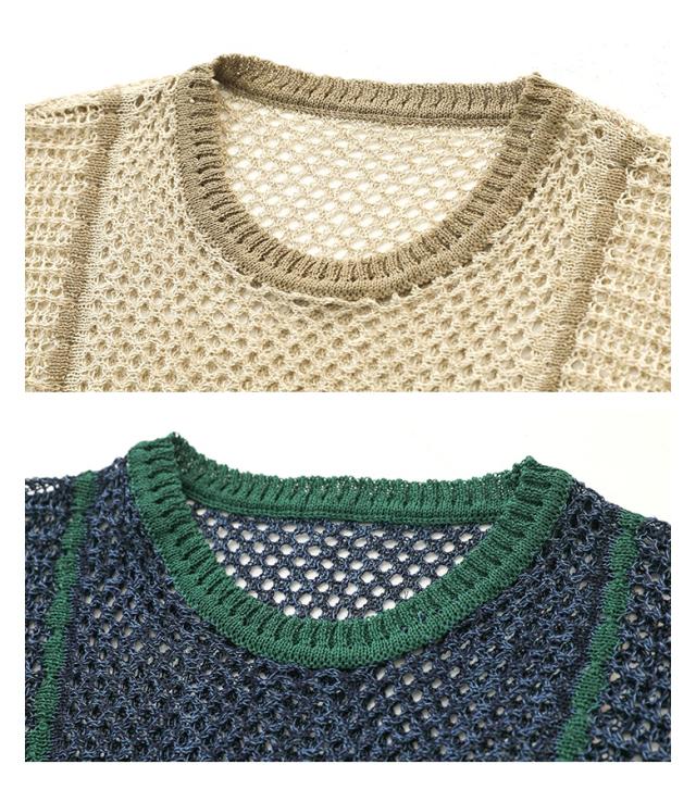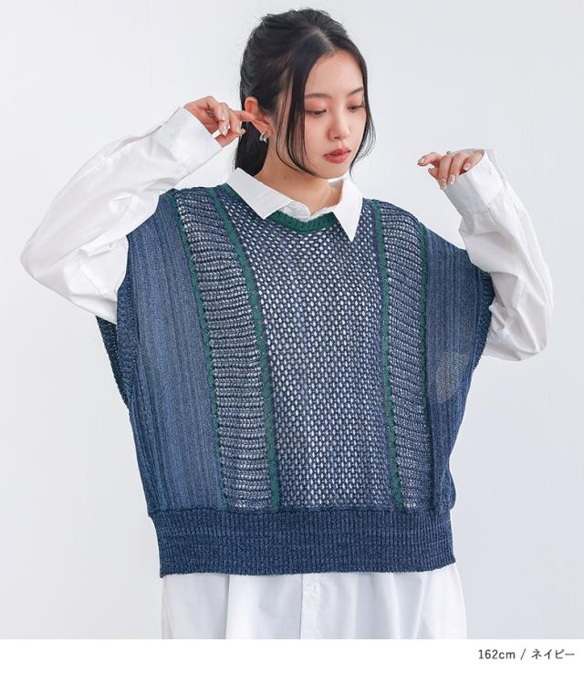 ニットベスト レディース ニットトップス メッシュニット クルーネック ノースリーブ 配色ライン 春 夏 秋 オシャレウォーカー 【TP】 トップス ニット セーター サマーニット ノースリーブニット ざっくりニット 透かし編み フレンチスリーブ ショートスリーブ ミディ丈 ミドル丈 ライン 配色 無地 洗える おうちで洗える 薄手 涼しい カジュアル シンプル ナチュラル キレカジ 可愛い系 大人女子 大人可愛い お洒落可愛い 大人カジュアル 上品 きれいめ ベーシック ニュアンス ラフ Sサイズ Mサイズ Lサイズ LLサイズ 3Lサイズ XLサイズ フリーサイズ ぽっちゃり 体型カバー 大きいサイズ プラスサイズ 10代 20代 30代 40代 50代 60代 低身長 高身長 女子会 オフィス 通勤 通学 お買い物 お出掛け 旅行 おしゃれ お洒落 トレンド 流行 osharewalker ベージュ モカベージュ ネイビー 紺色 紺 グリーン 緑色 緑[ID]11tp01x[配色LINE入りメッシュ編みベスト]