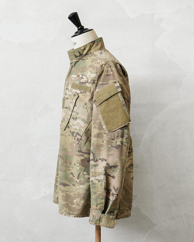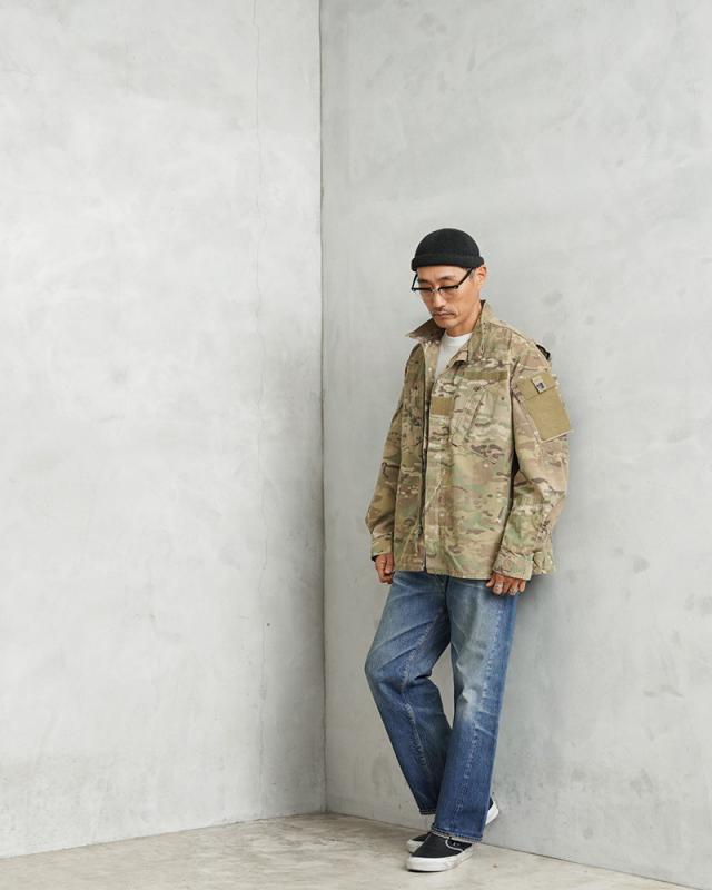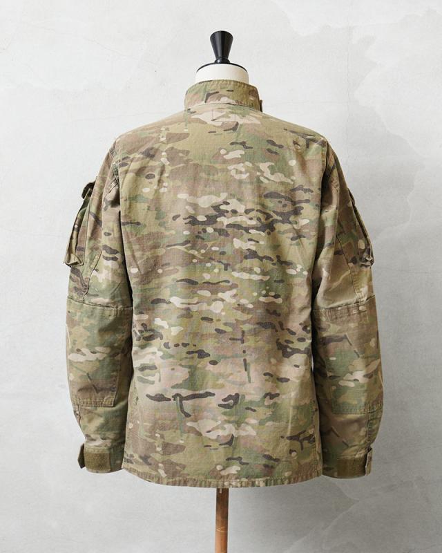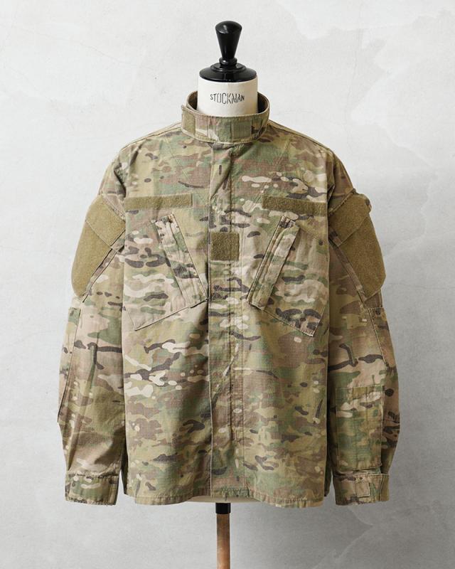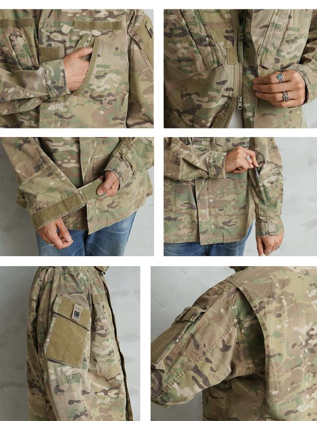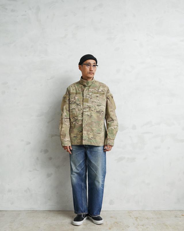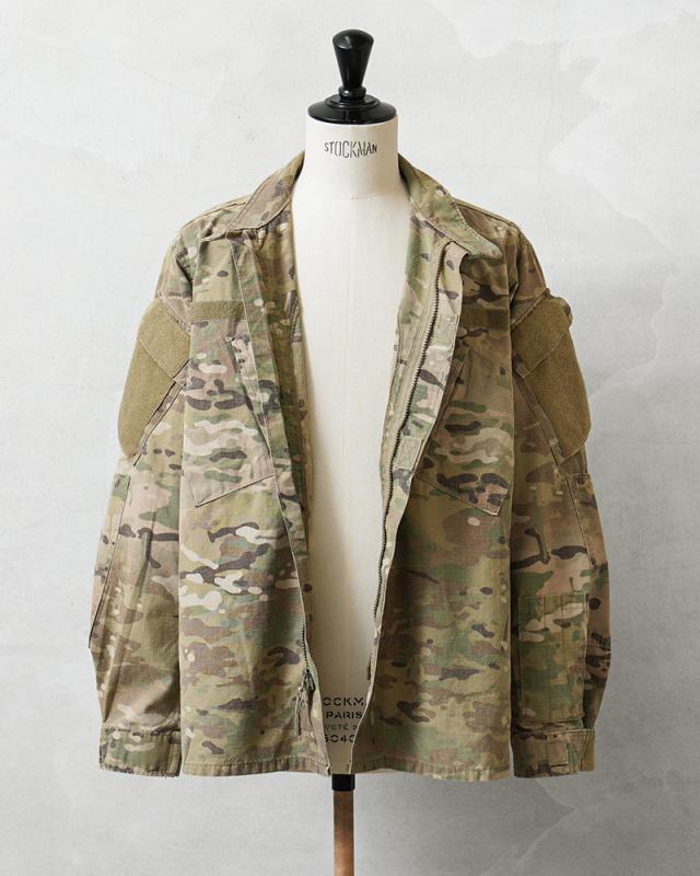 米軍実物のFLAME RESISTANT(難燃素材)コンバットジャケットです。迷彩には米軍を代表するMULTICAMパターンが採用されており、実際に米軍部隊で使用されていた実物装備の一つです。実戦環境での使用を前提に設計されたミリタリーウェアならではの高い機能性と耐久性が特徴です。このジャケットは2000年代以降、アメリカ軍で使用されてきたコンバットジャケットの一つで、兵士の安全性を考慮して難燃素材が採用されています。素材はレーヨン、アラミド、ナイロンの混紡生地で、耐熱性や耐久性に優れながら着心地も考えられた作りです。迷彩にはMULTICAMパターンが使用されており、自然に溶け込むカラーリングが特徴です。