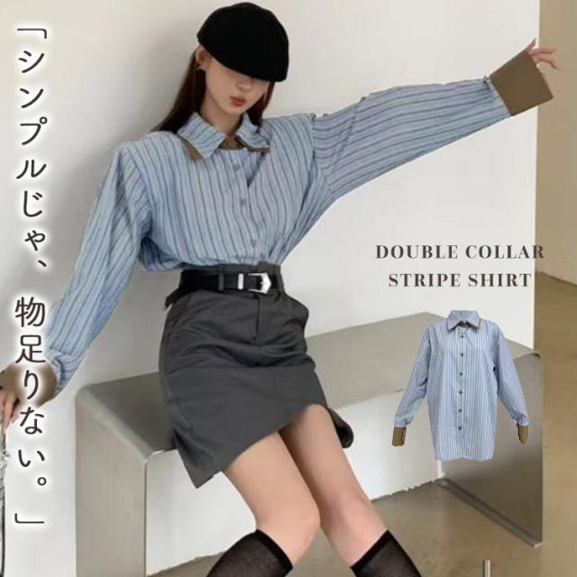 「周りと差がつくダブルカラー」シャツ ブラウス レディース トップス ストライプシャツ 長袖 きれいめ オーバーサイズ 羽織 ゆったり ダブルカラー ドロップショルダー カフスボタン ストライプ