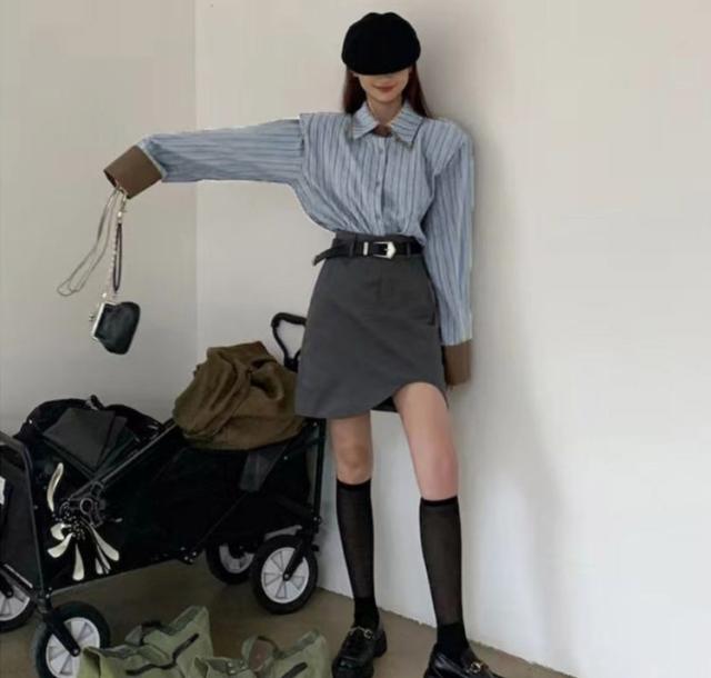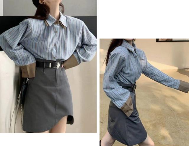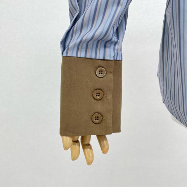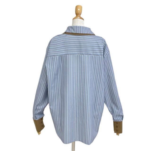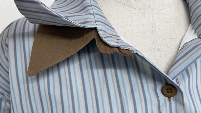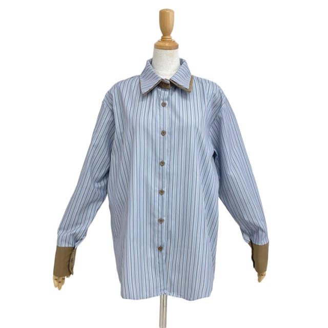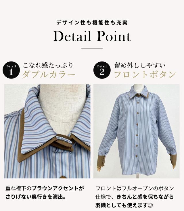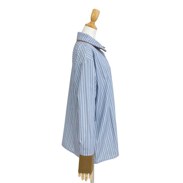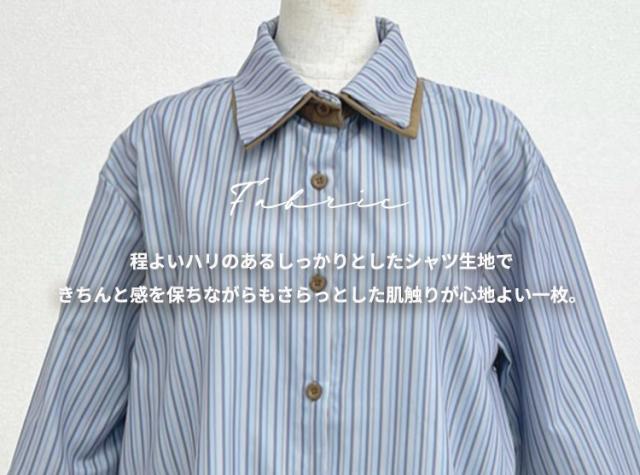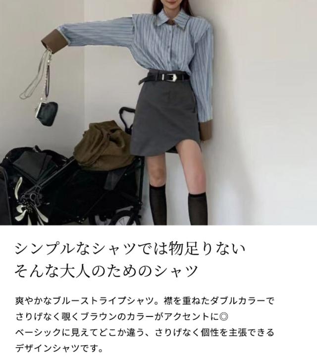 爽やかなブルーストライプシャツ。襟を重ねたダブルカラーでさりげなく覗くブラウンのカラーがアクセントに◎