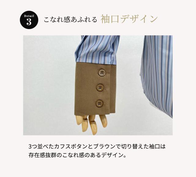 3つ並べたカフスボタンとブラウンで切り替えた袖口は、存在感抜群のこなれ感のあるデザイン。