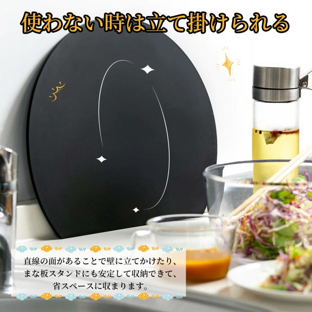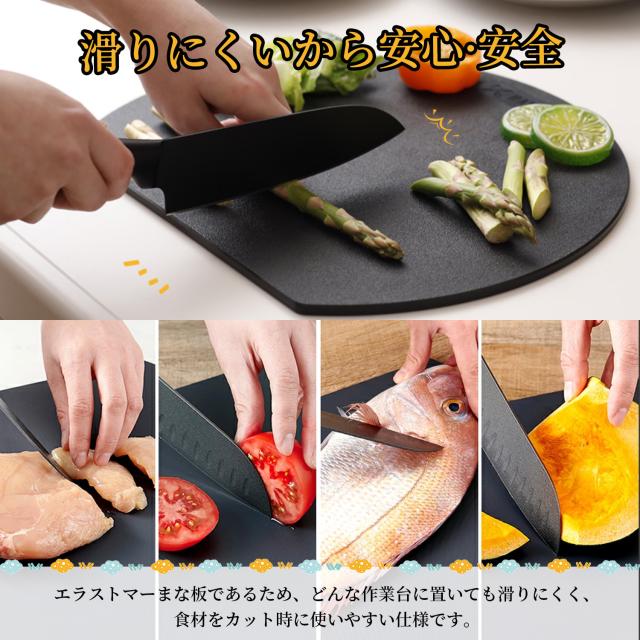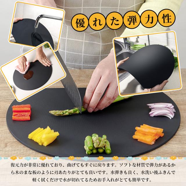 傷もつきにくく水はけのよい素材 100%熱可塑性エラストマーを採用! 木製のまな板のようなやわらかな刃あたりで、食材がすべりにくく刃がしっかりと入り込むので、 お肉やお魚、カボチャなどの硬い食材もしっかり楽に切ることができます。 切った食材を移動させながら効率良く作業ができ、切った食材をまな板の上に置 いたまま他の食材をカットすることもできます。 面積が広い丸形だから、カットした食材を並べて置いてお皿いらず!