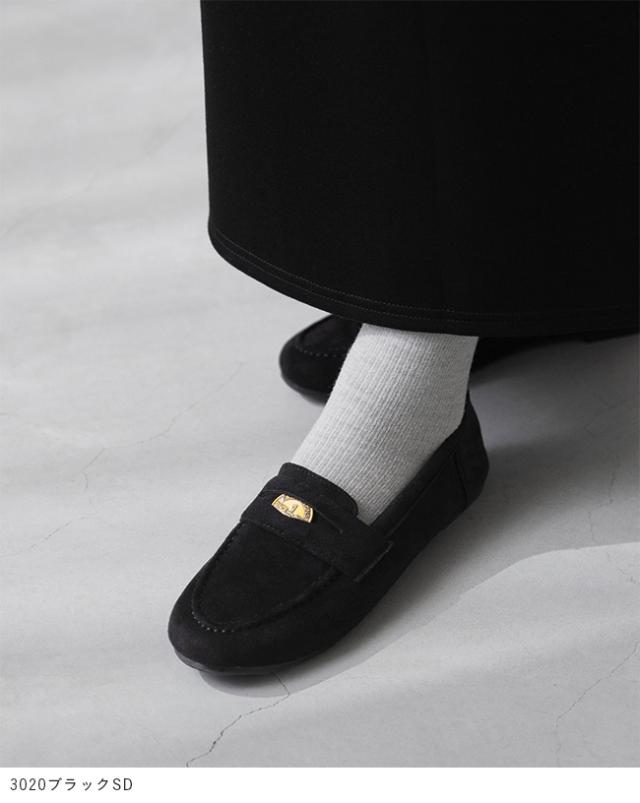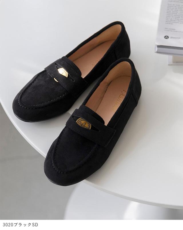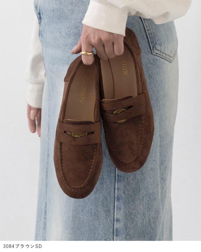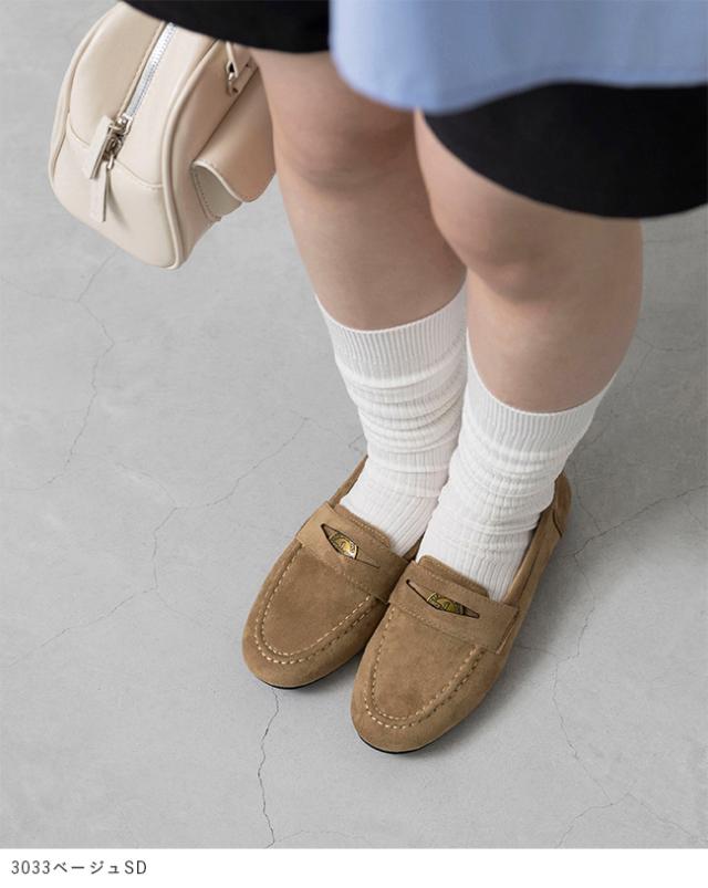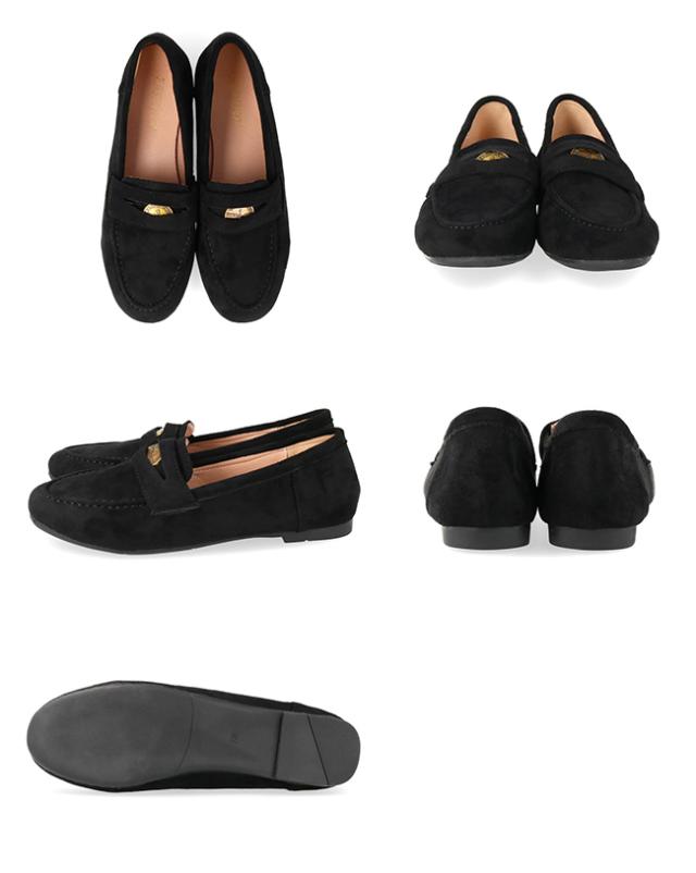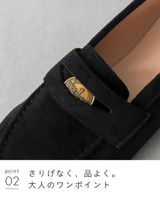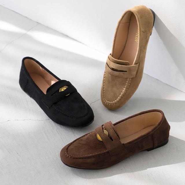上品な質感のスエード調素材に、旬のゴールドコインパーツを添えた贅沢な一足。