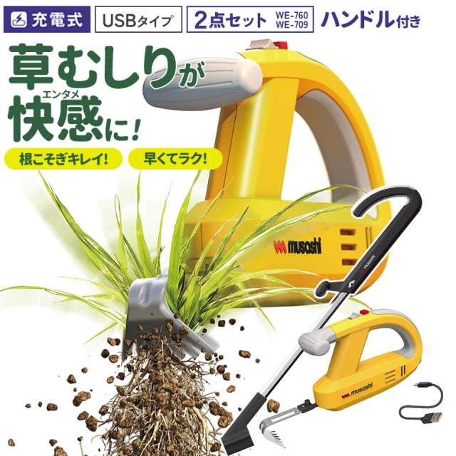 草刈り機 雑草抜き ムサシ 充電式 除草バイブレーター USBタイプ ハンドル付き(WE-760/WE-709) 草取り 草むしり 草抜き 振動除草 除草機 ガーデニング 園芸用品 雑草 畑 庭 手入れ 花 ガーデン DIY コードレス