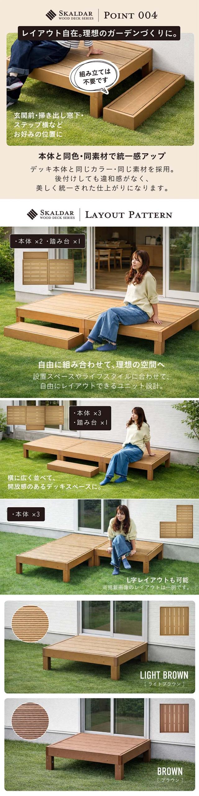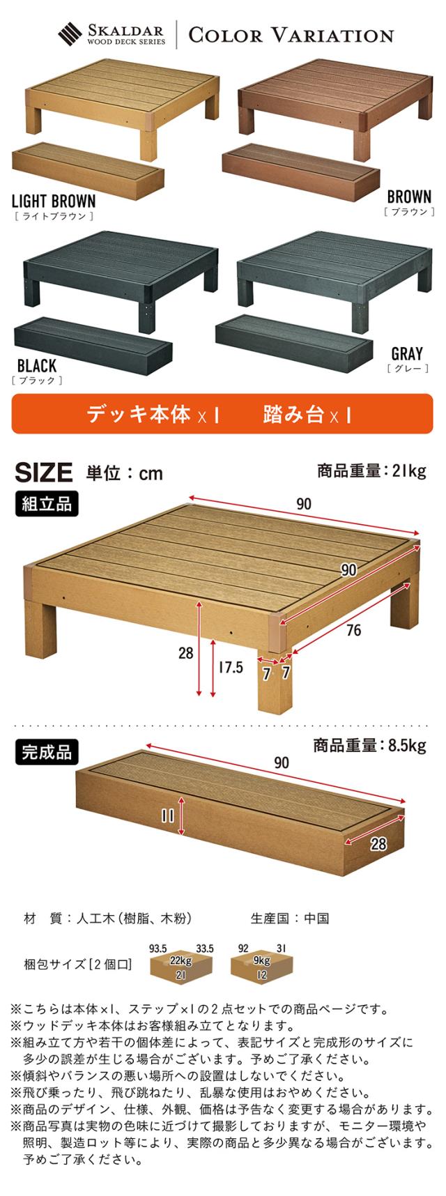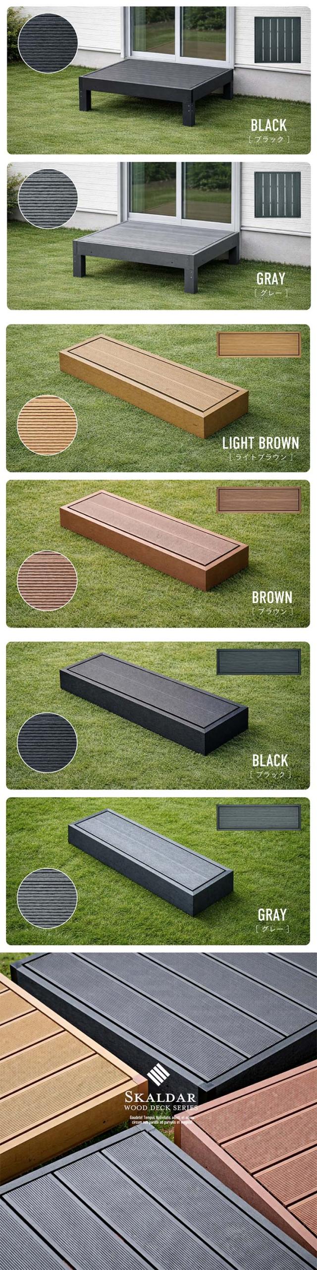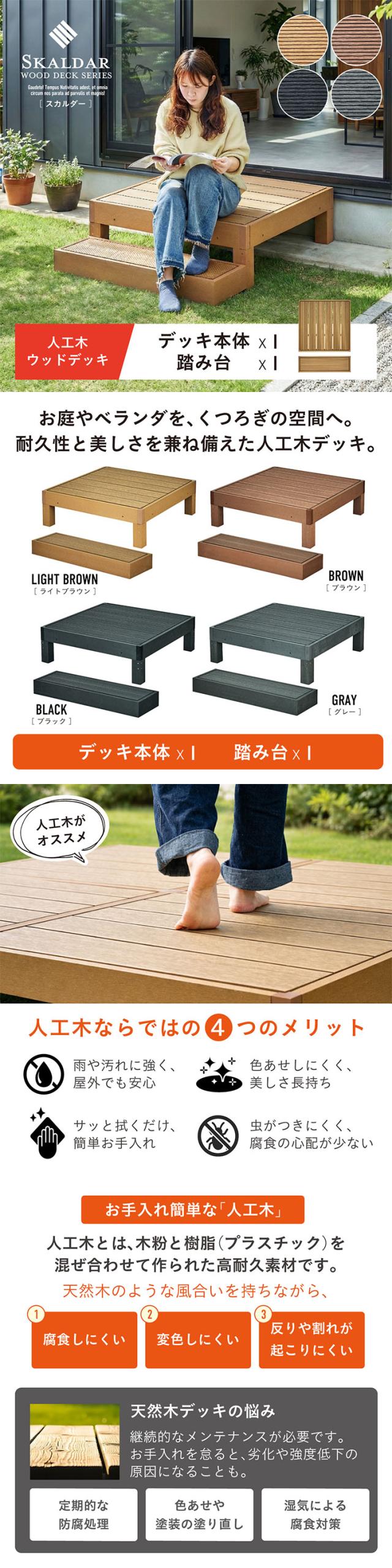 人工木 ウッドデッキ 90×90cm 本体 正方形 連結可能 ガーデンデッキ 樹脂デッキ ベランダデッキ 屋外 庭 バルコニー DIY エクステリア 高耐久 防腐 防虫 耐水 Skaldar スカルダー 本体1個 ステップセット 4色対応