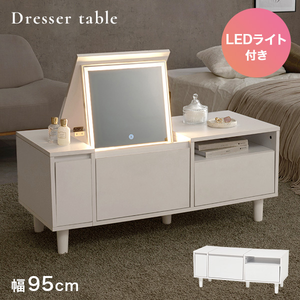 ドレッサー テーブル ドレッサーテーブル LEDライト付き 白 おしゃれ 収納 大容量 コンパクト 95cm ローテーブル デスク 机 コスメテーブル 女優ドレッサー センターテーブル LED ライト ホワイト