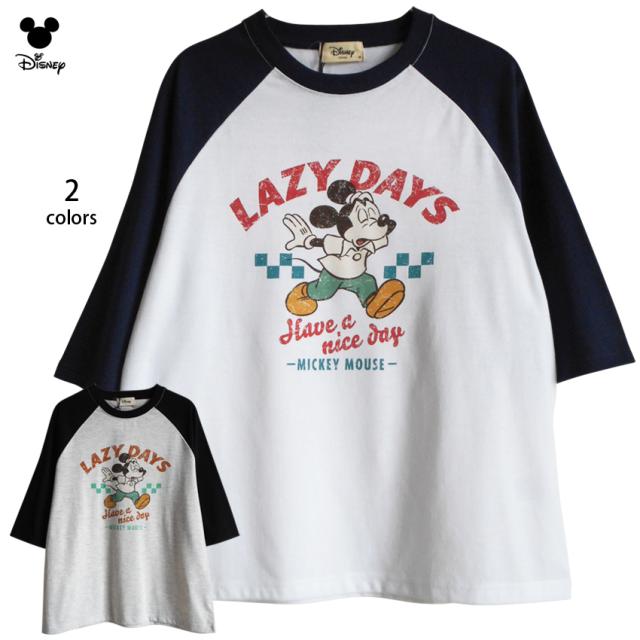 送料無料 Tシャツ 7分袖 ミッキー レディース メンズ ディズニー ミッキーマウス ラグラン ねぼすけ lazydays かすれプリント 野球 ベースボールシャツ 大きいサイズ ゆったり ワイド 半袖 USA 古着風デザイン ビッグサイズ disney ペアルック TDL 白 グレー ネイビー