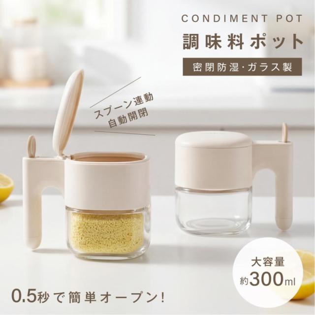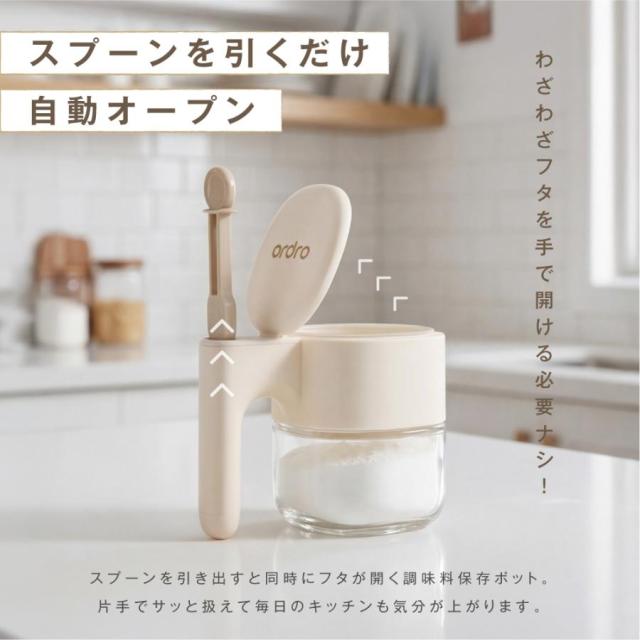 【自動オープン】わざわざフタを手で開ける必要ナシ!スプーンを引き出すと同時にフタが開く調味料保存ポット。片手でサッと扱えて毎日のキッチンも気分が上がります。