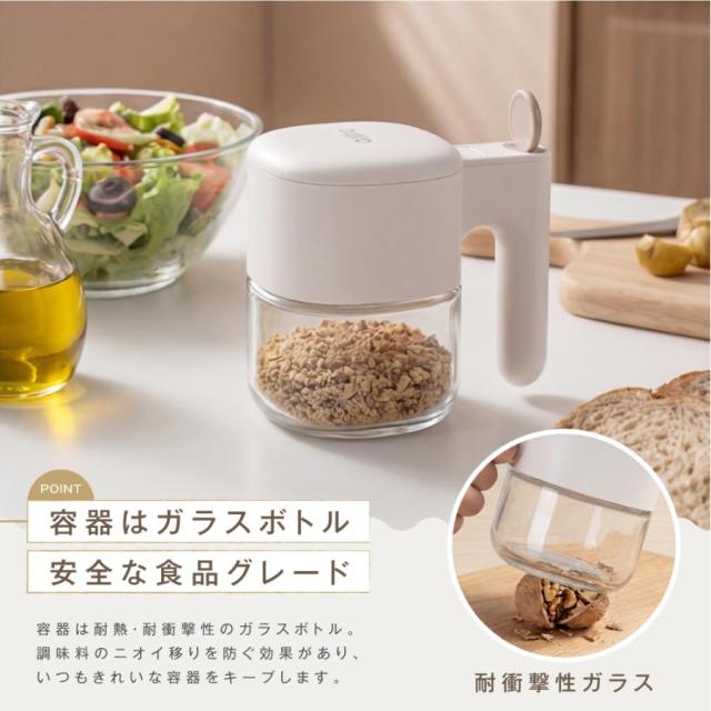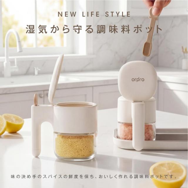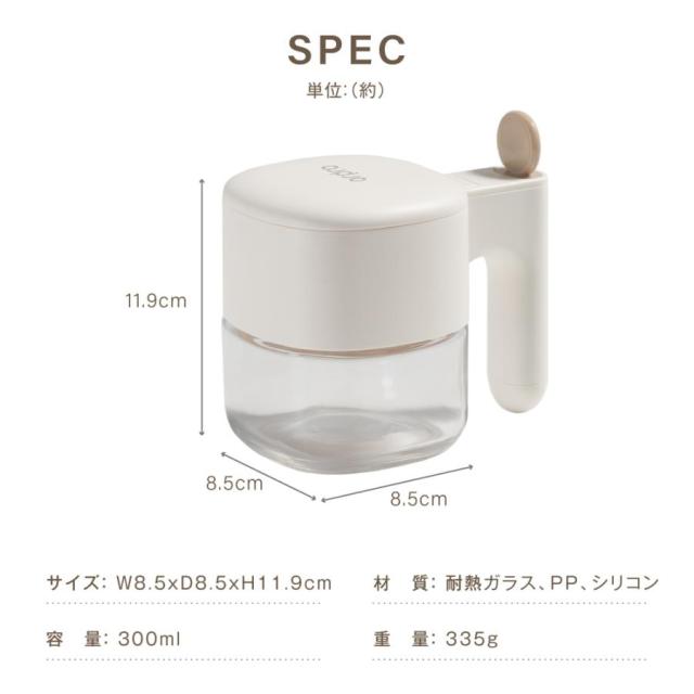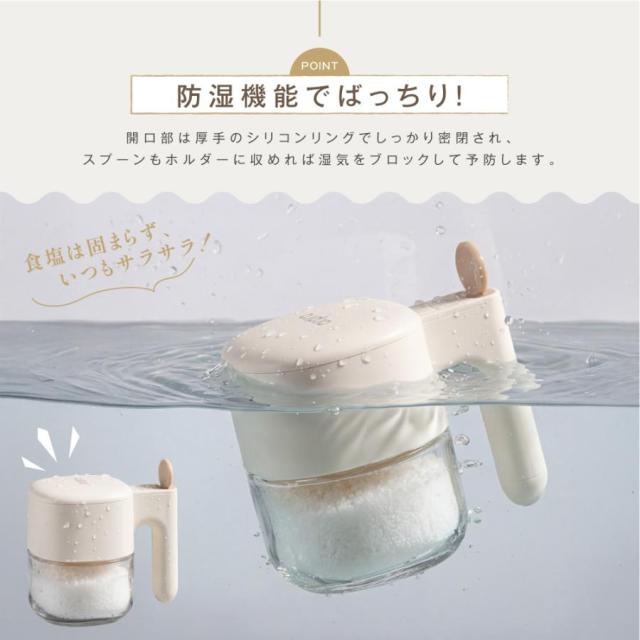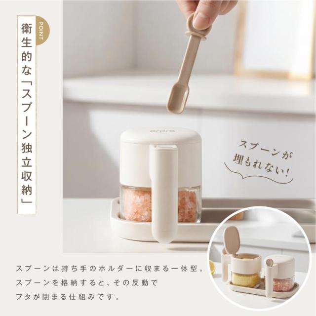 【防湿機能でばっちり!】味の決め手のスパイスの鮮度を保ち、おいしく作れる調味料ポットです。 【スプーン独立収納】スプーンは持ち手のホルダーに収まる一体型。スプーンを格納すると、その反動でフタが閉まる仕組みです。スプーンはひとさじ3.5gの計量サイズにすることで、料理レシピに合わせて、ぴったりの味付けを可能にしています。