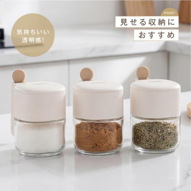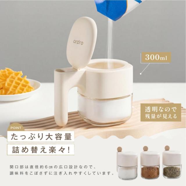 調味料ポット 調味料入れ スプーン付き 密閉 防虫 300ml容量 調味料 ガラス製 ストッカー ラック 塩 砂糖入れ 湿気防止 自動オープン 食品保存 保存容器
