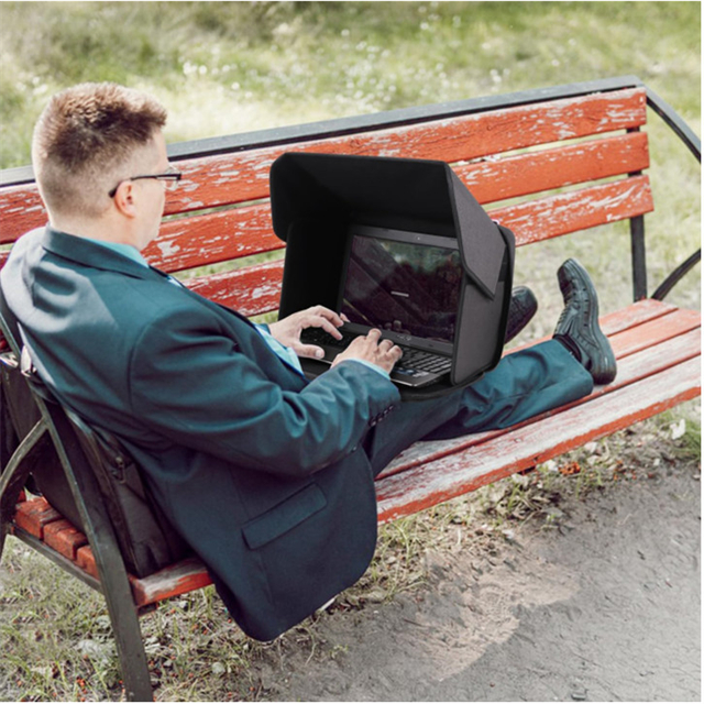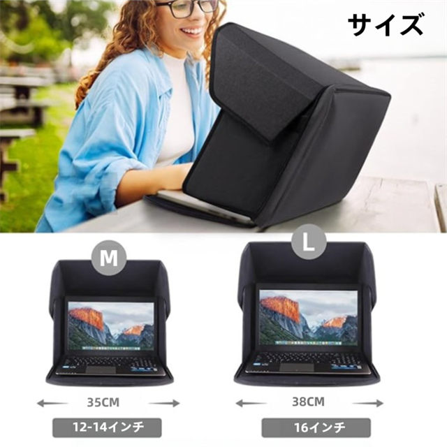 ・屋外でのノートパソコン作業に最適な、折りたたみ式の遮光・目隠しフードです。強い日差しや周囲からの視線をカットし、画面の見やすさを大幅にアップ。