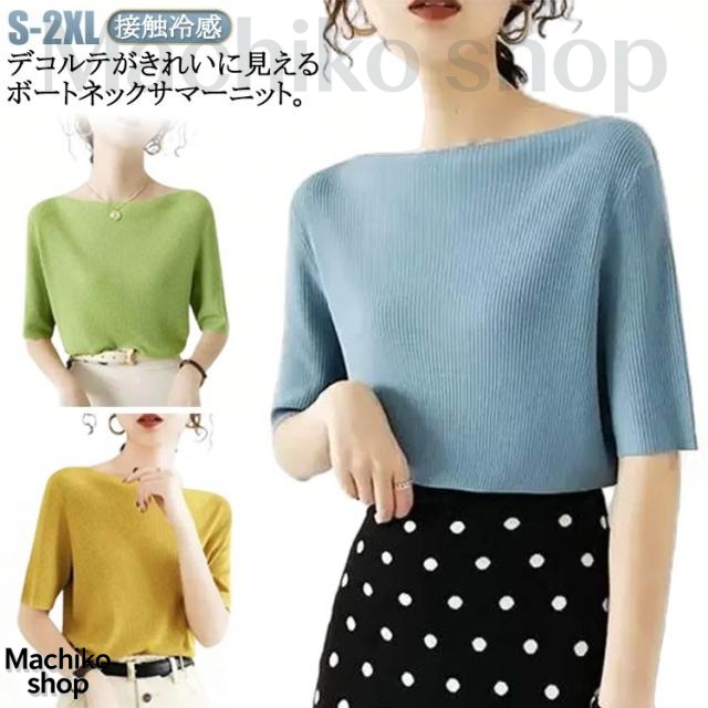 送料無料 サマーニット アイスシルクセーター レディース トップス 無地 ボートネック アイスシルク リブニット 大人 五分袖 半袖 tシャツ ショート丈 ニットソー 着やせ トップス プルオーバー ライトニット 接触冷感 涼しい