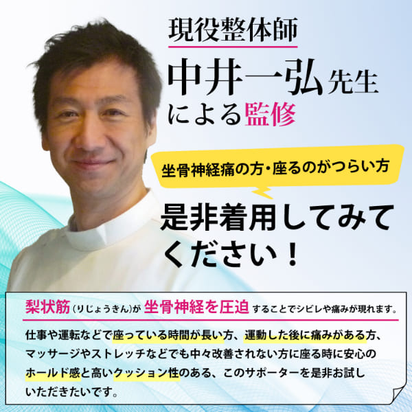 つらい坐骨神経の日常の痛みのケアを考えた安心サポーターです。硬い椅子や長時間座るのがつらい方に、このサポーターを履くことで左右の特殊パッド(坐骨パッド)で自重を体圧分散します。それにより安心して座る事できる事で理想の姿勢をキープできます。衣類の下にも着用できるインナータイプのため普段のお出かけの時にも着用可能です。また、お尻のお肉が少ない事で座るのがつらい方にもおすすめのサポーターです。