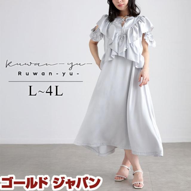 春新作 大きいサイズ レディース ワンピース 前後2wayサテンフリルワンピース ロング 前後 2way フリルスリーブ フリル 肌見せ Aライン サテン 光沢感 エレガント オケージョン 無地 ゆったり 夏服 秋服 L LL 2L 3L 4L ライトグレー ゴールドジャパン ルワンユー ruwanyu