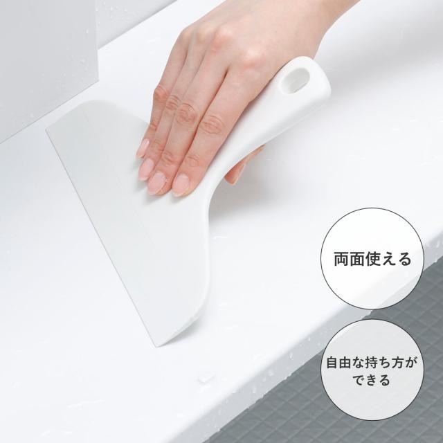 両面が使えて向きを気にせず自由な持ち方ができます。縦横どちらにも動かしやすく、小回りが利くので浴槽のカーブやバスカウンターなどスペースの限られた場所にも使いやすいです。