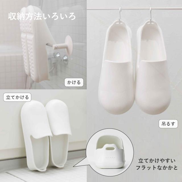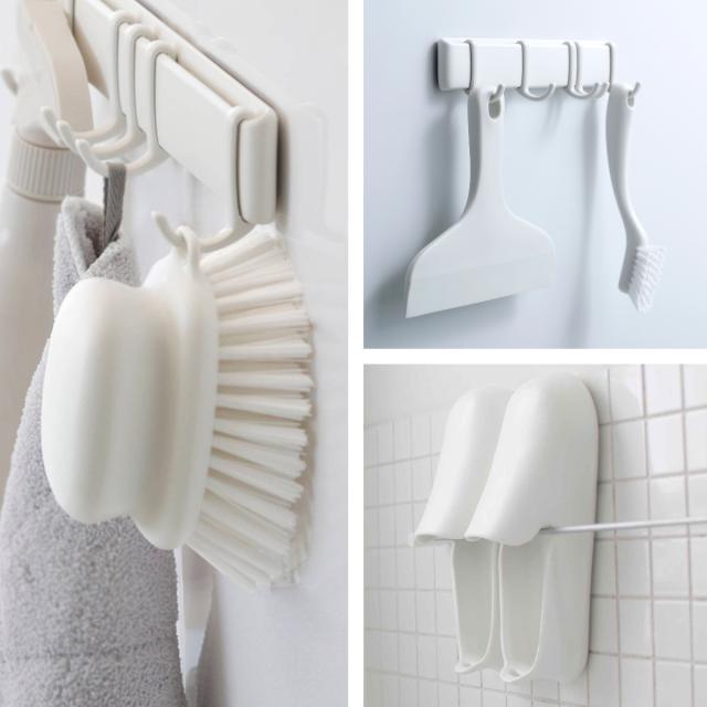 ブラシとスキージーは穴付きなので、マグネットフックに掛けて収納できます。お風呂のスリッパは浴室のタオルバーなどに掛けたり、S字フックを使用して収納できます。