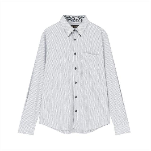 台衿内側とカフス裏の他に、衿羽根にプリント別布を配しモード感を強調したデザインはすっきりしたシルエットでタックイン・アウトどちらでも洗練した雰囲気に。