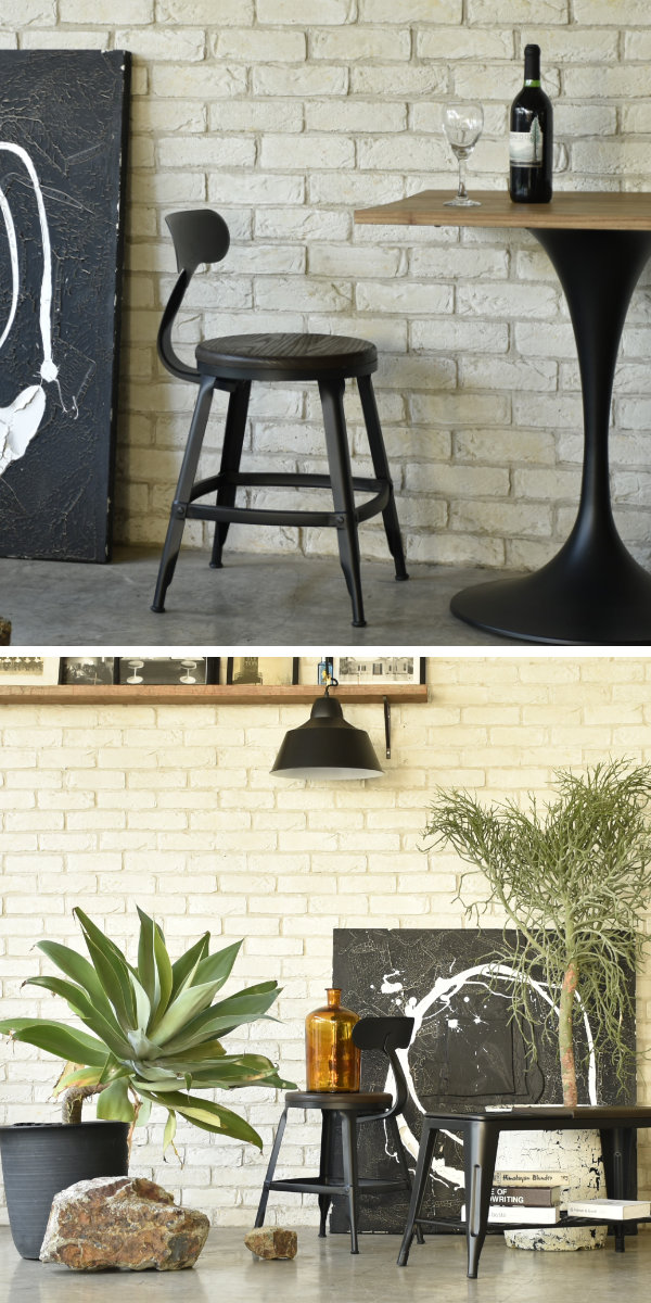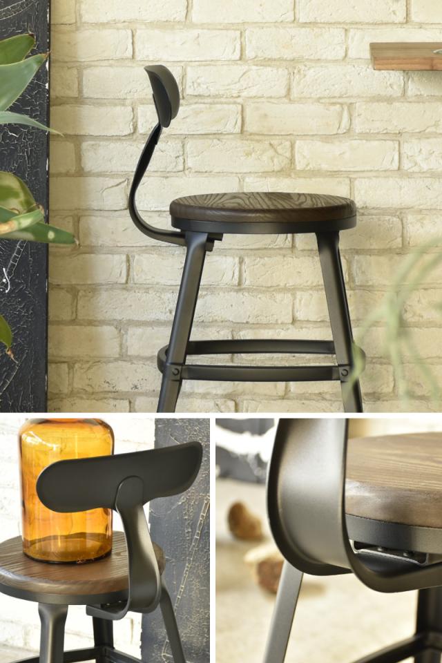 背もたれや脚部には風合いのあるスチール素材を使用。マットな質感がヴィンテージテイストを引き立て、空間に程よい無骨さと落ち着きをプラスします。