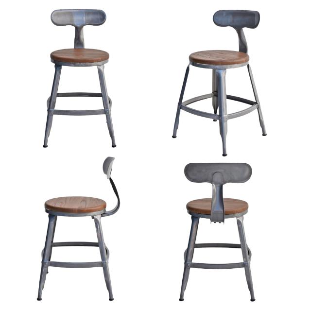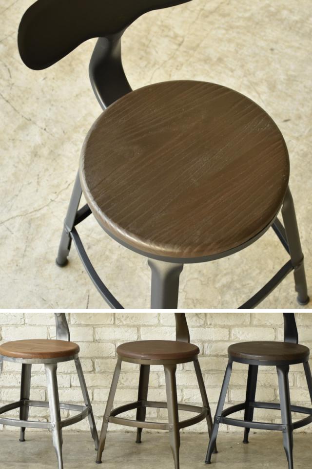 座面にはニレ材(エルム材)を使用した天然木の座面を採用。木目の表情が一つひとつ異なり、スチールとの組み合わせが温かみのあるインダストリアルな印象をつくります。