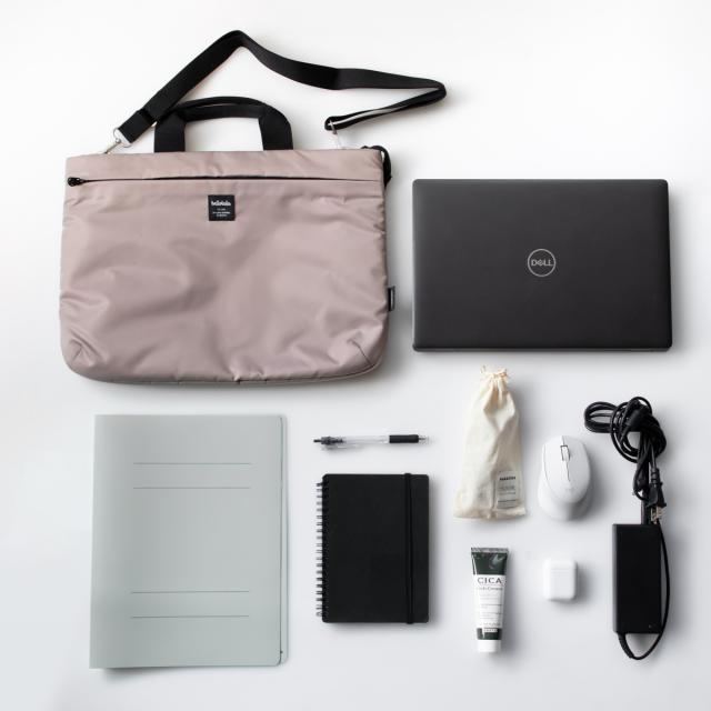 ノートPCだけでなく、A4ファイルや書類、筆記用具、PC類の小物も一緒に入れて持ち運べる大容量サイズです。ポケットも豊富で、毎日の通勤や通学、カフェワークなど、幅広いシーンで活躍します。