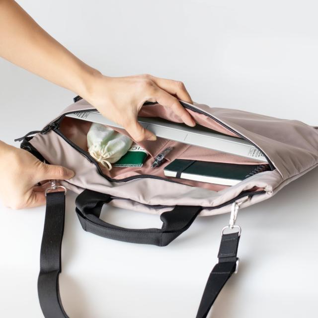 ノートPCをスマートに持ち運べるPCバッグです。ショルダーストラップを付ければ肩掛け・斜め掛け、外せばハンドバッグとして使える3WAY仕様。シンプルなデザインで、ビジネスからカジュアルまで幅広いスタイルに馴染みます。