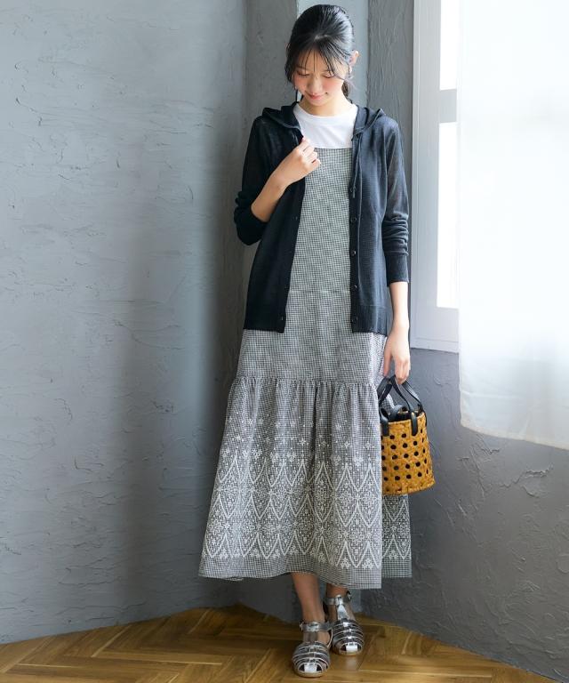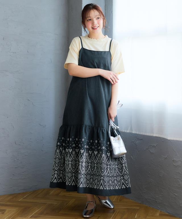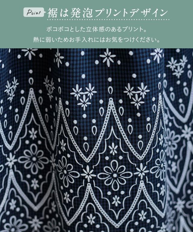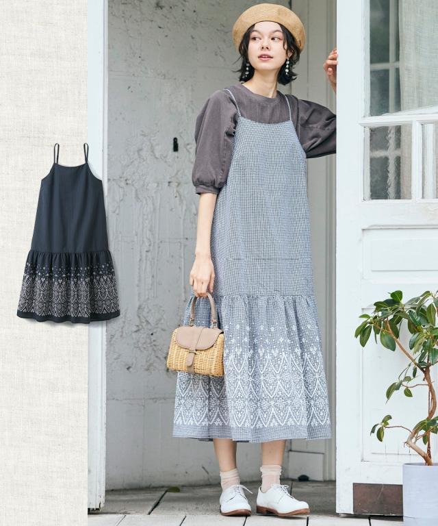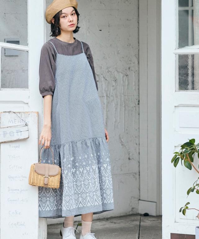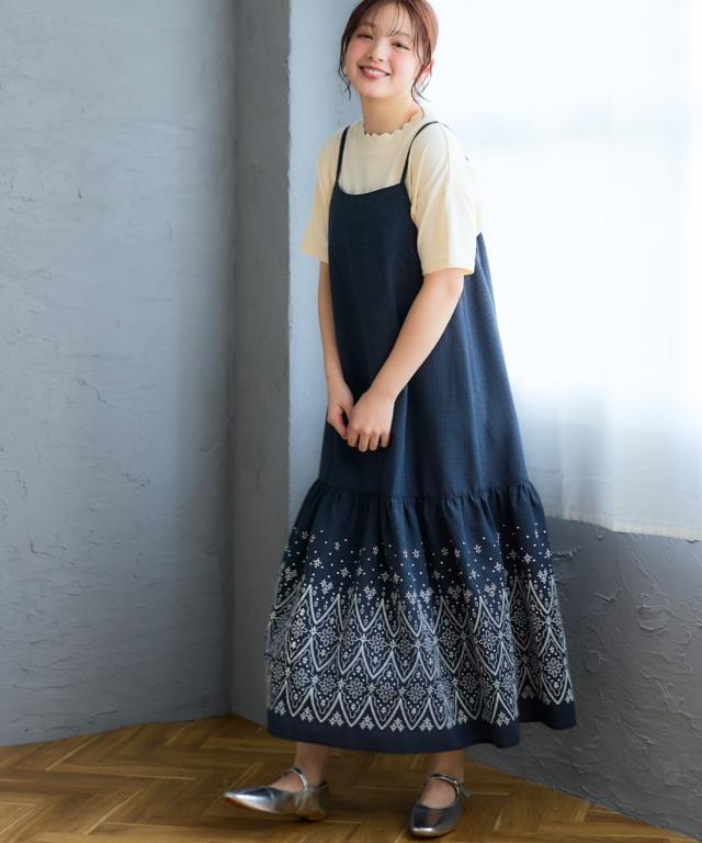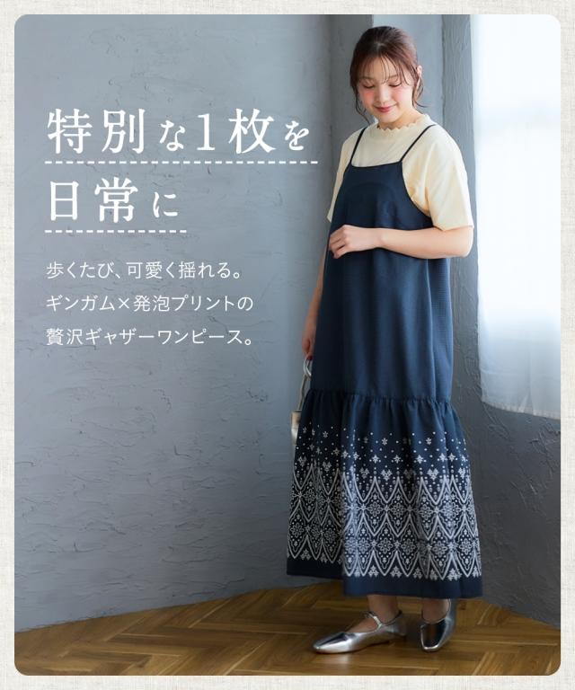 ◇ぱっと着るだけで、心ときめく日常◇ 等身大の自分をもっと好きになれる、贅沢な裾プリントキャミソールワンピース。 忙しい毎日でも、袖を通すだけでパッと華やぎ、自分らしく素敵になれる一着をお届けします。定番のギンガムチェックに、立体感のある発泡プリントを贅沢にあしらうことで、ナチュラルな中にも大人の遊び心をプラスしました。気負わずに着られるのに、どこか特別感を感じさせる。そんな「ご機嫌な毎日」に寄り添う、こだわりのワンピースです。 ■デザイン 歩くたびにドラマチックに揺れる、たっぷりとしたギャザー切り替えがデザインの主役。裾部分には存在感のある繊細な発泡プリントを施しており、シンプルなギンガムチェックをぐっと垢抜けた印象に格上げしています。 大人に嬉しい工夫として、背中部分にゴムを入れることで、フロントはスッキリとした見た目を保ちつつ、ゆったりとしたリラクシーな着心地を実現しました。気になるお腹周りやヒップラインをふんわりとカバーしてくれるAラインシルエットは、体型を選ばず美しく着こなせます。サイドや後ろ姿まで抜かりなく可愛く、一枚でサマになる主役級のアイテムです。 ■素材 肌あたりの良い綿と、シワになりにくいポリ
