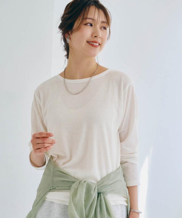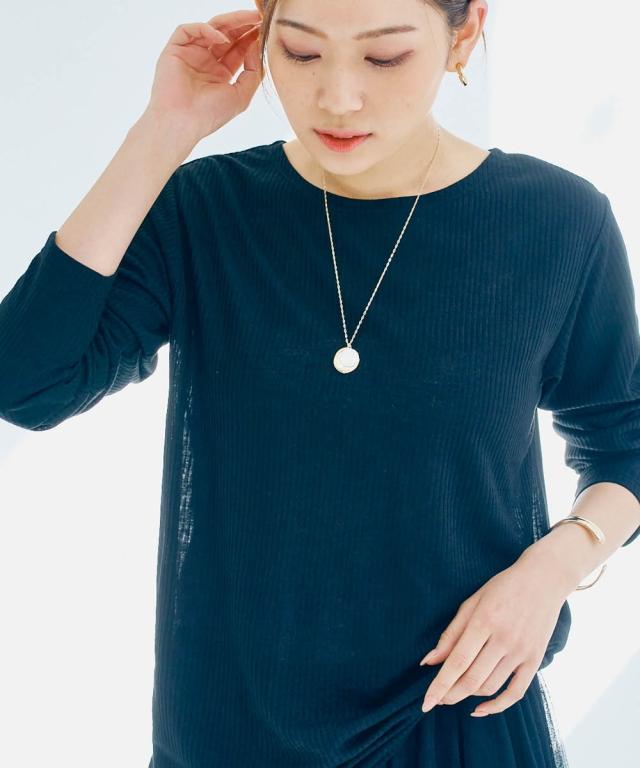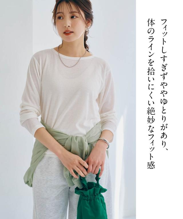 ◆日常に溶け込む洗練されたシアーの輝き◆ 一着で周りと差がつく、大人のためのリブシアークルーネックトップス。 ただシンプルできれいなだけでは物足りない、そんなオシャレを楽しみたい女性に贈る一着です。軽やかなシアー素材が、いつもの着こなしに新鮮な風を吹き込み、袖を通すだけでパッと華やかな印象へと導きます。肩の力を抜いた自然体な美しさと、スタイリッシュな品性を両立させ、あなたの毎日をより輝かせる万能アイテムとして、今こそクローゼットにプラスしたい一着です。 ■デザイン ミニマルな美しさを追求しながらも、細部までこだわり抜いた設計が魅力です。繊細な細リブの縦ラインを施すことで、視覚的なスタイルアップ効果を叶え、すっきりとした細見せを実現しました。体のラインを拾いすぎない絶妙なゆとりのあるストレートシルエットに仕立てているため、体型を気にせずリラックスして着用いただけます。また、やや長めの身丈に設定することで、裾をクシュっとさせてこなれ感を演出したり、タックイン・アウトどちらのスタイルも美しくサマになるように計算されています。首元はあらゆるアイテムとレイヤードしやすいすっきりとしたクルーネックデザインで、オンオフ問わず