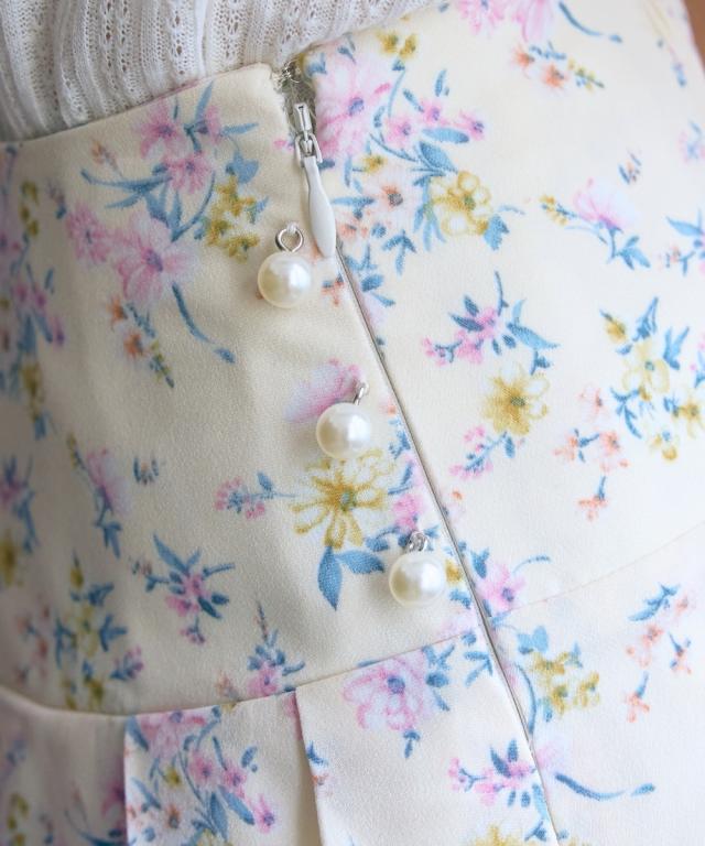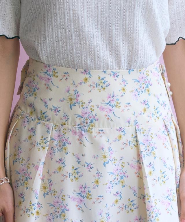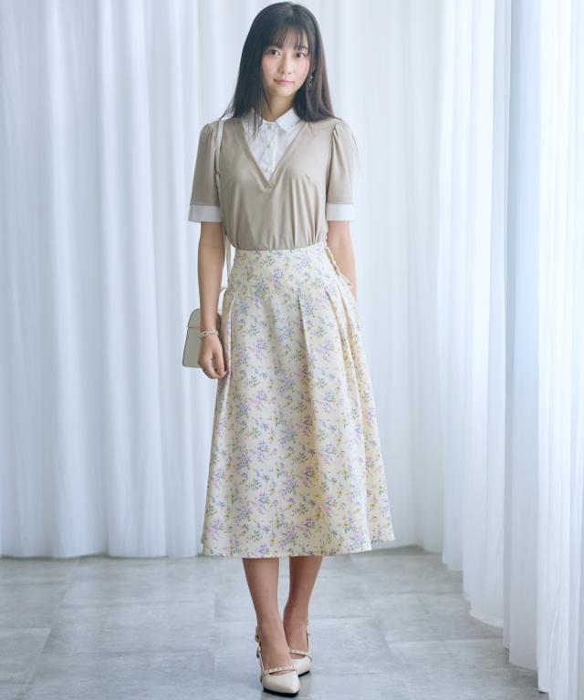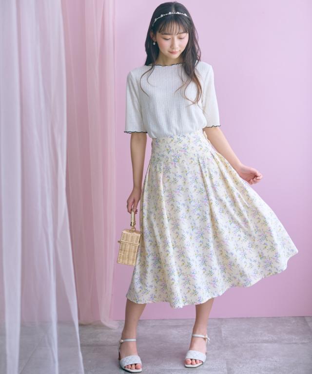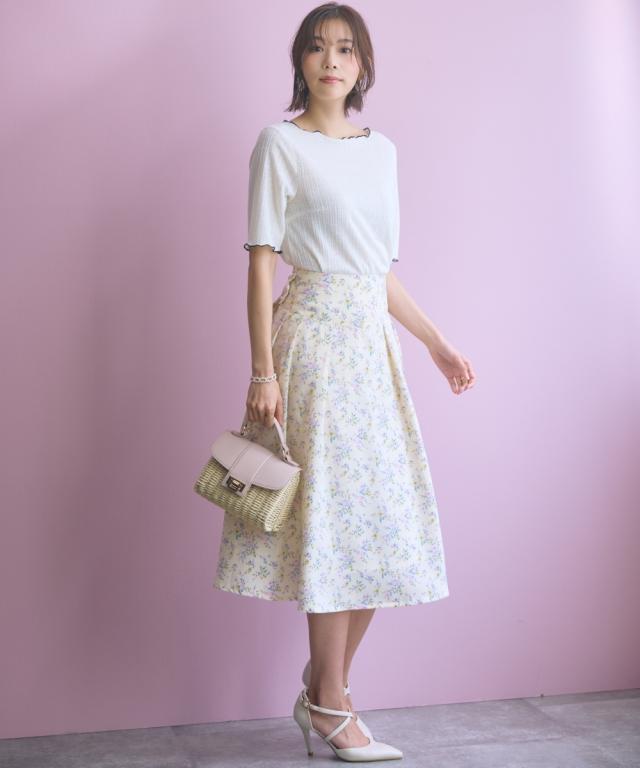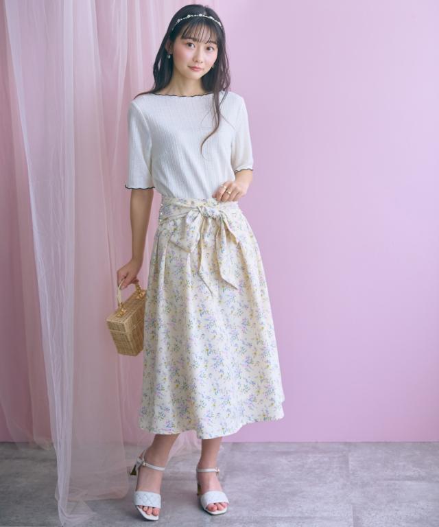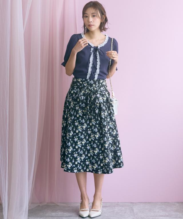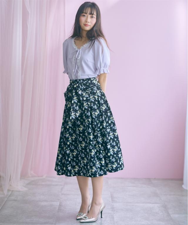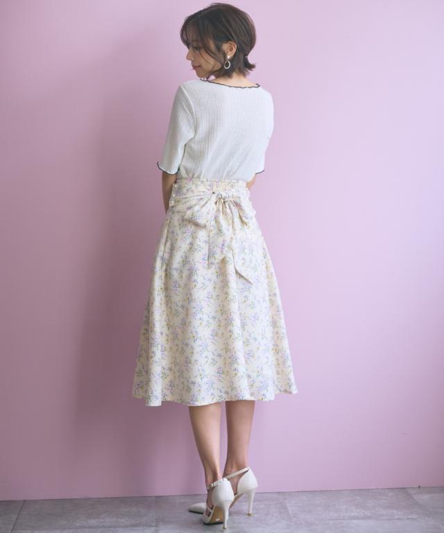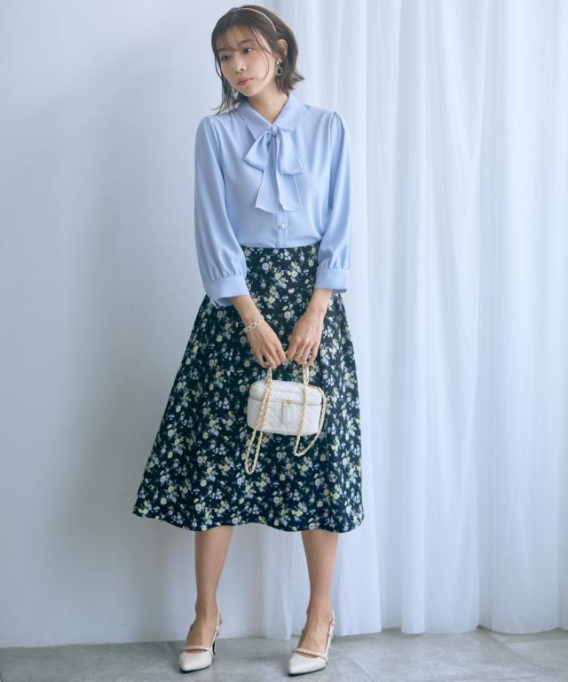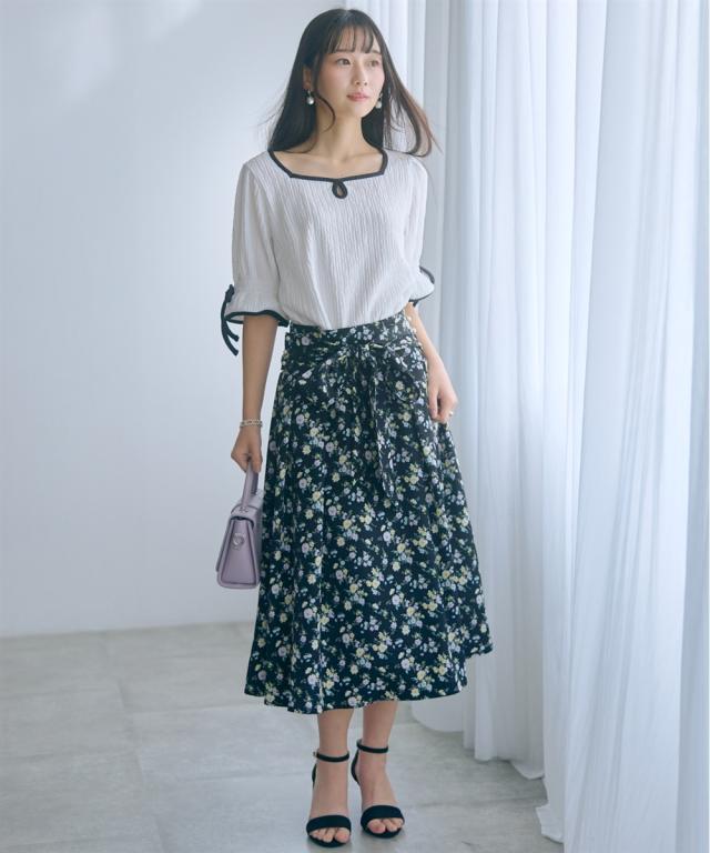 コーディネートをパッと華やかに彩るフェミニンなフラワープリントスカート。 前後付け替えが可能なリボンが、抜かりなく可愛く演出してくれる主役級の一着です。 ■デザイン 360度どこから見ても可愛いリボン使いが 共布の大きなリボンがウエストにアクセントを添え、メリハリのあるシルエットを実現。トップスインが美しく決まります。上品に広がるフレアシルエット 裾に向かってたっぷりと生地を使用したフレアラインが、歩くたびに優雅に揺れ、女性らしさを引き立てます。大人可愛いフラワープリントは繊細な花柄が上品な印象を与え、甘くなりすぎず幅広い年代の方に楽しんでいただけるデザインです。 ■素材 軽やかな質感です。季節を問わずさらりと着用できます。 ■おすすめのスタイリング レースブラウスと合わせて清楚さ溢れる「王道フェミニン」。透け感のあるシアーやシンプルなリブニットを合わせて大人っぽさを引き立てる「上品クラシック」。コンパクトなパフスリーブのカットソーと合わせて「爽やかガーリー」コーデ等。スカートにボリュームがあるため、トップスは「コンパクト」にまとめると、素材の持つしなやかな揺れ感がより美しく映えます。