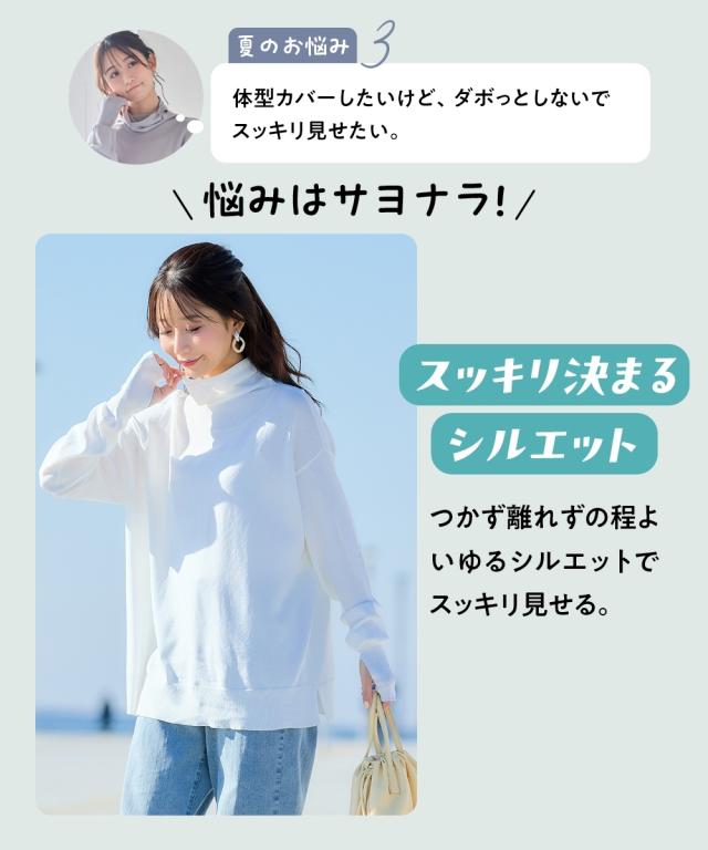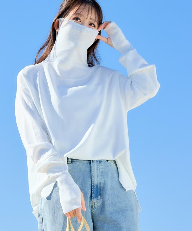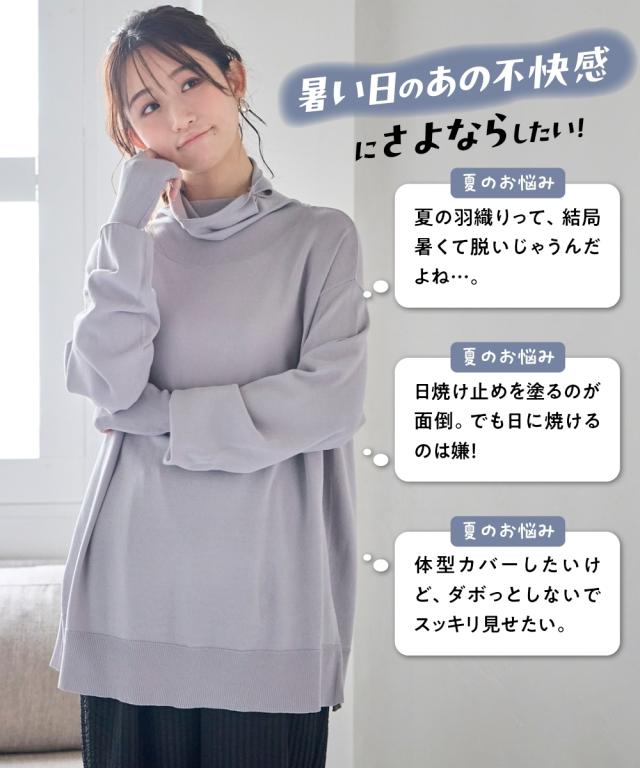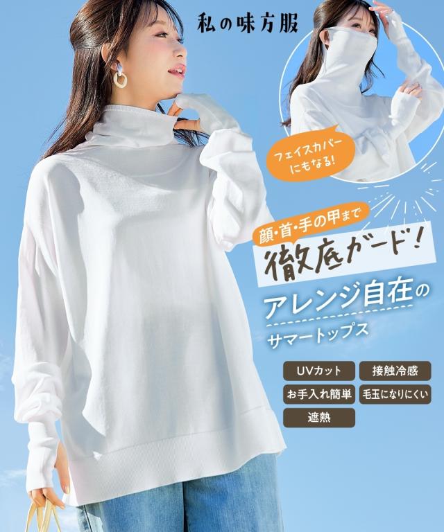 顔から手元まで、まるで日陰をまとっているような安心感を 日傘が差せないシーンの強い味方、まとう日陰服。 いちばん大切な普段の日を、もっと快適に、もっと幸せに。そんな「私の味方服」ブランドから、夏の強い日差しに立ち向かう画期的なニットトップスが登場しました。運動会や夏フェス、重い荷物を持つ買い出しなど、日傘を差したくても差せない瞬間はありませんかこの一枚は、UVカット・遮熱機能を備え、まるで自分だけの動く日陰を持ち歩いているような心地よさを提供します。日常のあらゆる場面であなたを紫外線から守り抜き、お出かけをポジティブに変えてくれる、まさに毎日の暮らしに寄り添う一着です。 ■デザイン マルチウェイに活躍する機能美デザイン。体型を拾わないシルエットとアレンジ力で、お悩みを一気に解決。 最大の特徴は、首元から顔まわりまでをしっかりガードできるフェイスカバー一体型のハイネックデザインです。耳にかけられる仕様なので、日焼け止めを塗り直す手間が省け、首筋から頬まで鉄壁のガードを叶えます。もちろん、普段使いの際は襟元をくしゅくしゅとさせて、こなれ感のあるタートルネックとして楽しむことも可能。ゆったりとした身幅に、サイドスリットを