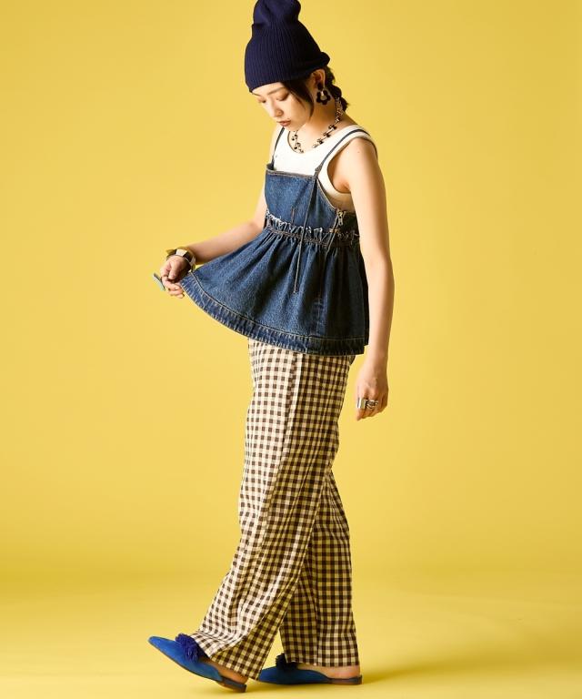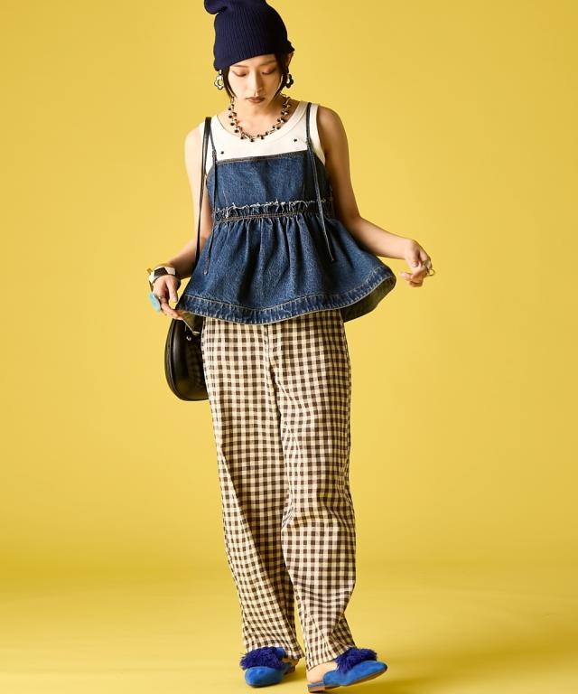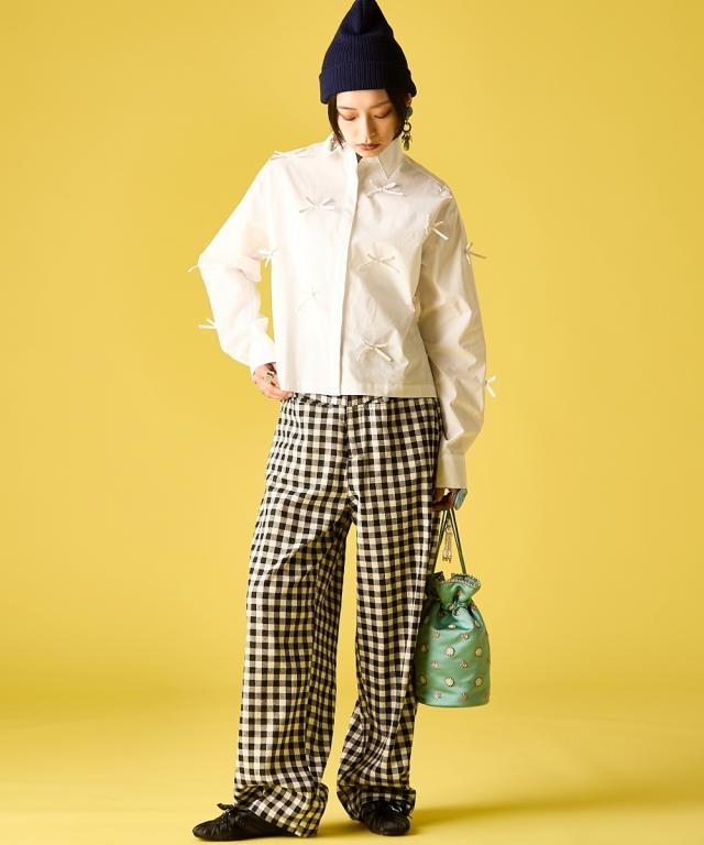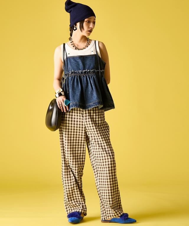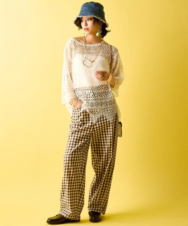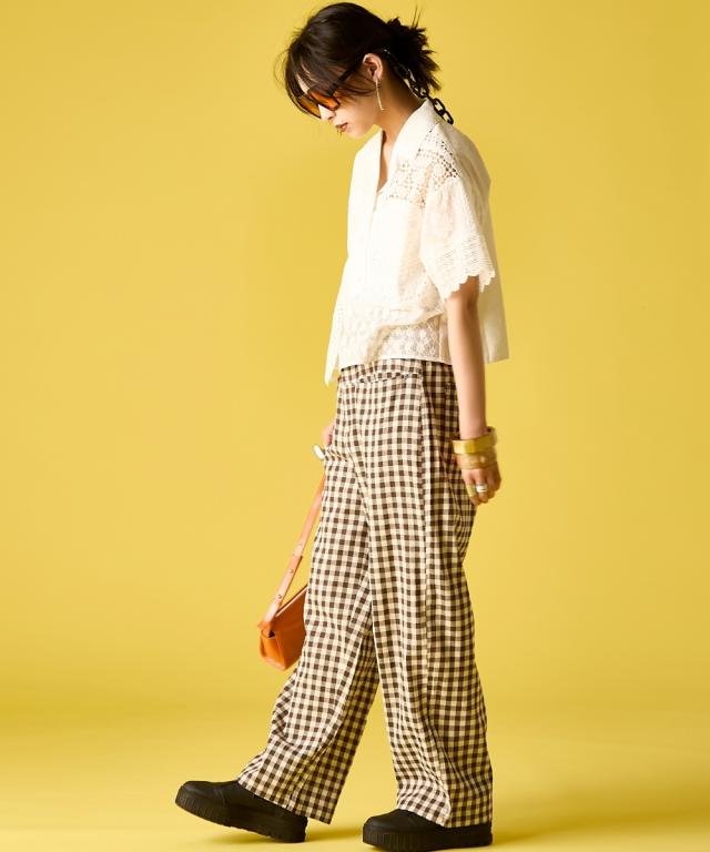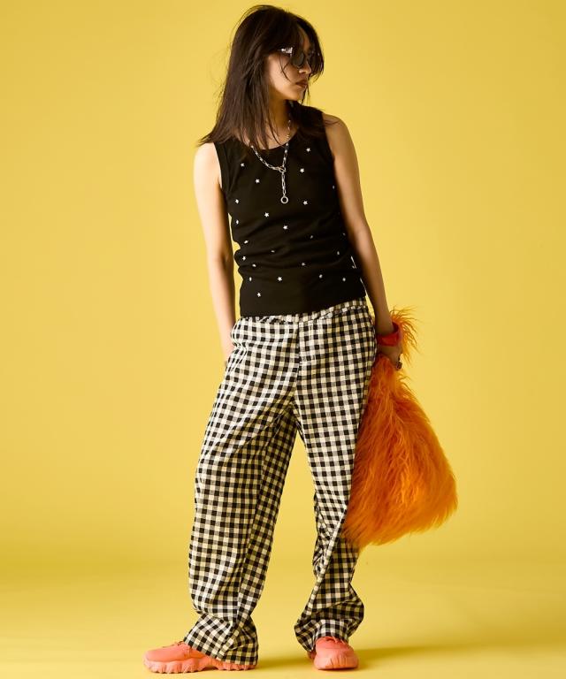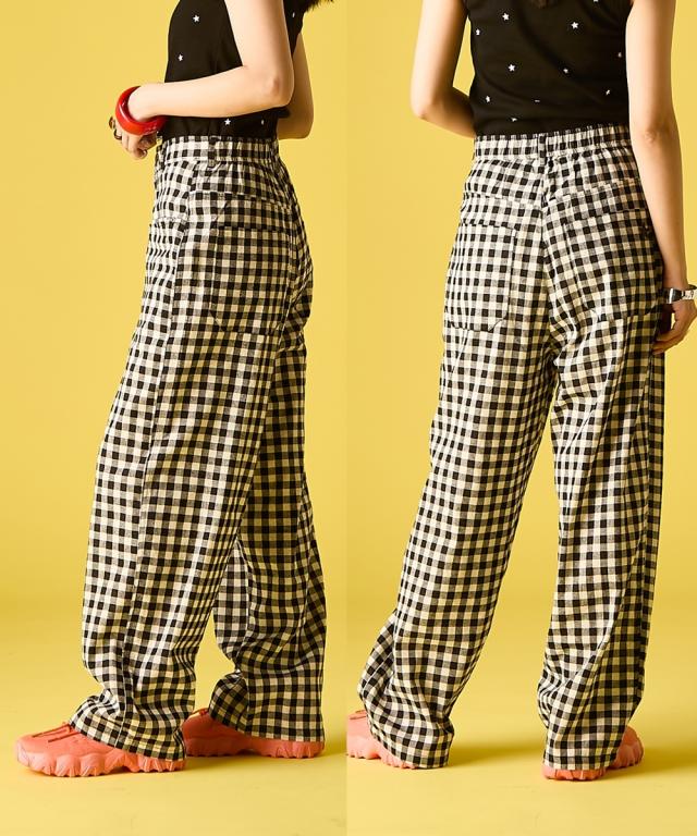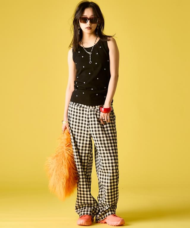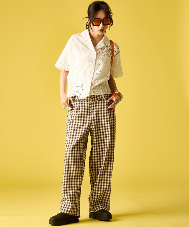視線を奪う柄のインパクトと、計算されたゆるさが、ストリートシーンでの圧倒的な存在感を放つ一着です ■デザイン 股上を長く設計しゆったりとしたサイズ感で 身体のラインを隠し、すとんと落ちるワイドな脚のラインが、ストリートらしい「抜け感」を演出します。 後ウエストはリラクシーなゴム仕様で着心地抜群。 ビッグロゴTシャツとのストリートな合わせから、繊細なレースシャツとのモードな着こなしまで、あらゆるトップスを「今」の表情に変えてくれます。 ■素材 薄手で軽く、さらっとした質感が魅力のサマーボトムにピッタリの素材を使用。 通気性が良く、真夏でもベタつきにくい清涼感を確保。 夏のパンツスタイルの核となる一本です。 ■おすすめのスタイリング 90's Street Icon Look:ビッグロゴチュニックTシャツを合わせ、裾をあえてアウトしたリラックススタイル。オレンジのサングラスやグリーンのサンダルでキャッチーな色遊びを加えました。 Sophisticated Mode Mix:レースパッチワークシャツやリボン付ショートシャツをトップスに。甘いディテールとマニッシュなギンガムのコントラストが、洗練された大人のストリートモードを完成させます。 Urban Sporty Layered:星刺しゅ