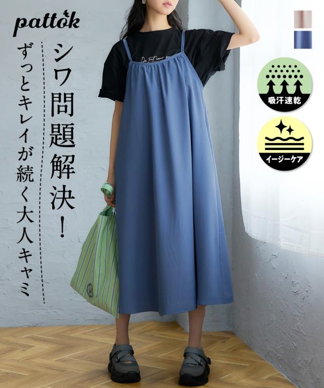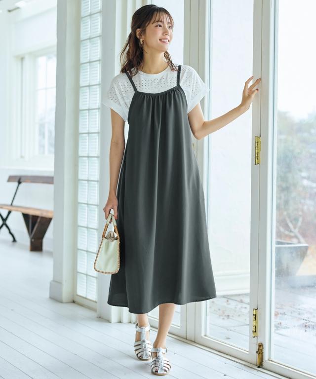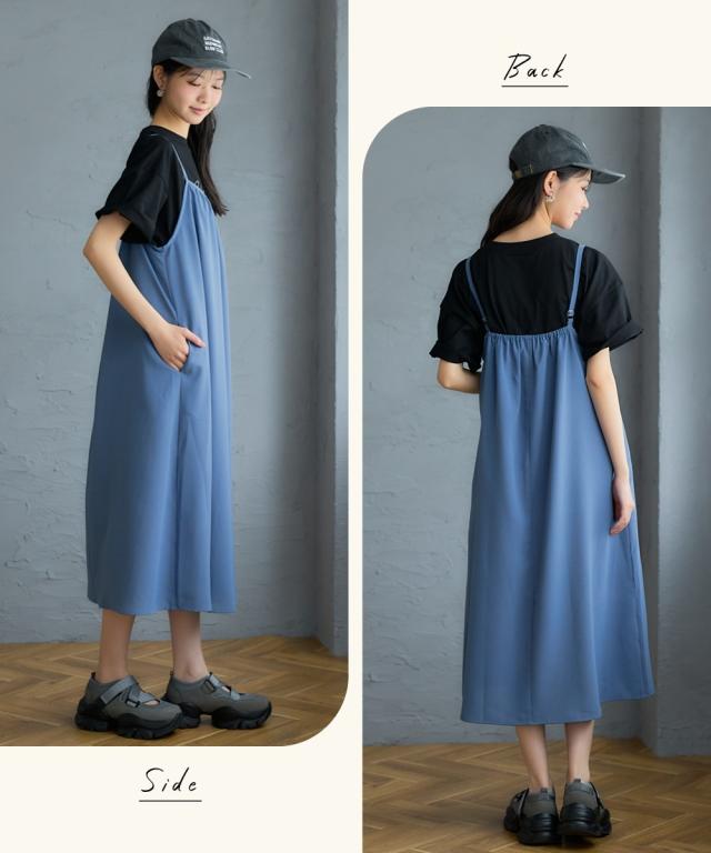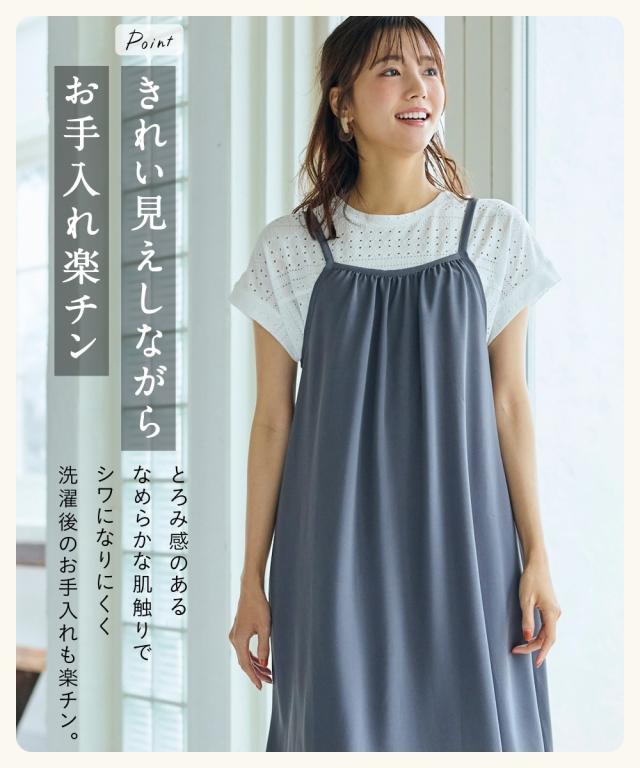 ◇ぱっと着るだけで、今の私が一番素敵に見える◇ とろみ素材の魔法で、頑張りすぎない大人の可愛さを手に入れて。忙しい毎日でも、袖を通すだけでコーディネートがさまになるこの一枚は、まさに理想のデイリーウェア。なめらかな質感が描くしなやかなシルエットが、体型をさりげなくカバーしながら、等身大の自分をより美しく引き立てます。おしゃれを楽に、そしてもっと楽しく。心まで軽やかになれるキャミソールワンピースが、あなたの日常に寄り添います。 ■デザイン 大人の女性に嬉しい、計算されたふわっとしたシルエットが魅力のデザインです。ゆったりとした身幅が、ウエストやヒップ周りなど気になるラインを優しく隠しつつ、落ち感のある生地のおかげで着膨れせずにすっきりとした印象を与えます。肩ひもにはアジャスターが付いているため、身長やその日のインナーの厚みに合わせて、お好みの丈感に細かく調整できるのも便利なポイント。さらに、日常使いに欠かせないポケットを両脇に配置するなど、実用性にもこだわりました。シンプルながらも洗練されたフォルムは、合わせるアイテムを選ばず、長く愛用できる一着です。 ■素材 肌の上を滑るような、とろみ感のあるなめらかなポリエス