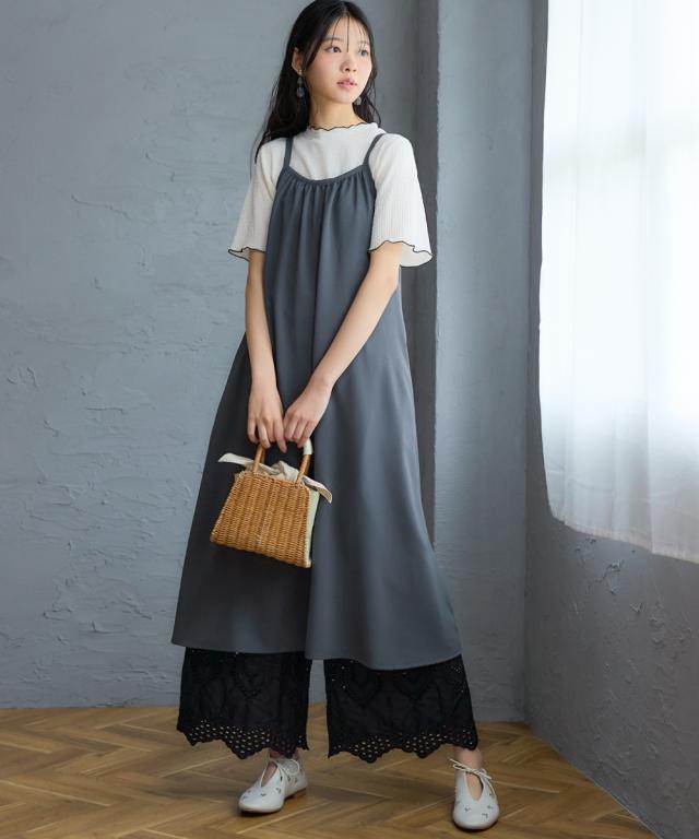 品質=ポリエステル100% [裏地]無 ポケット両脇 肩ひもはアジャスターで調整できます。 透け感:やや透ける ※色によって透け感が異なる場合があります。淡色カラーはベージュ系インナー着用をおすすめします。 伸縮性:なし 生地の厚み:薄い 光沢感:ややあり 裏地:なし ポケット:あり ※両脇 季節:夏 シルエット:普通 原産国:中国製 備考:洗濯機OK ネット使用