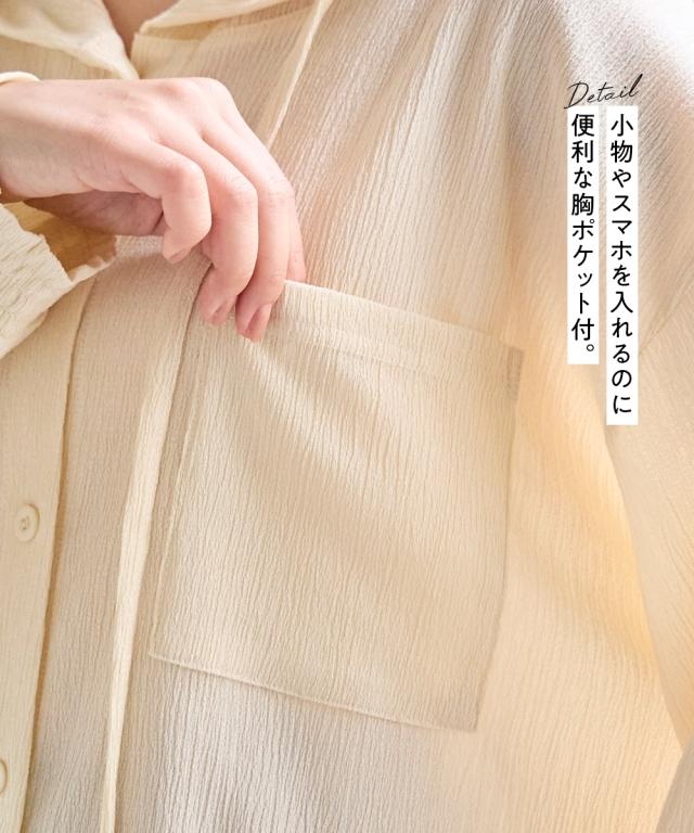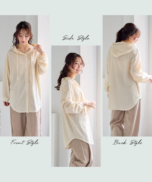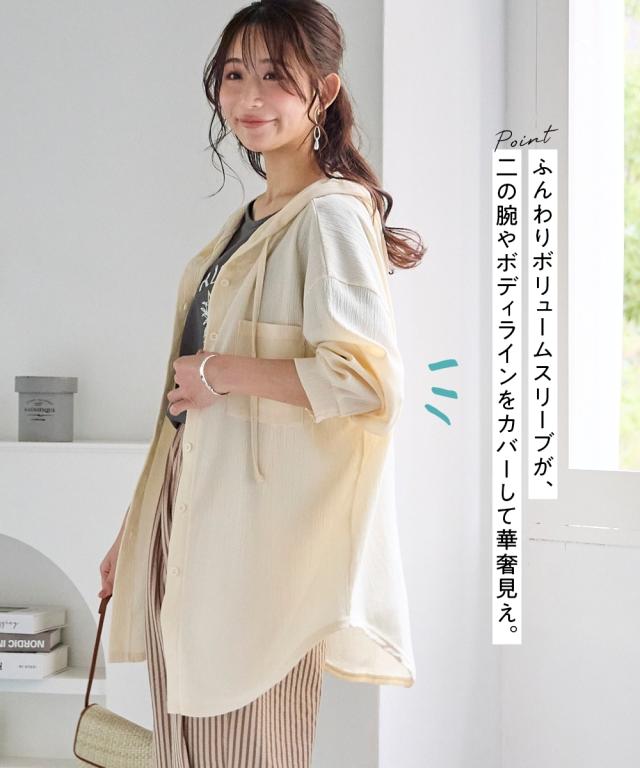 羽織るだけで、心まで軽やか。 「私の味方服」がいちばん大切な普段の日を、もっと心地よく、もっと幸せに。 今どきの抜け感とこなれスタイルがこれ一枚で完成します。 毎日の着やすさをトコトン追求し、動きやすさと「楽ちん」を両立。 日差しから肌を守るUVカット機能を備え、季節の変わり目から冷房対策まで、忙しいあなたの毎日を優しく支える、まさに「味方」になってくれるビッグフードシャツパーカーです。 ■デザイン ゆったりとしたオーバーサイズ設計が、今の気分にぴったりのビッグシルエット。 大きめのフードは顔周りをふんわりと包み込み、小顔効果を演出するとともに、バックスタイルにも可愛らしいアクセントを添えてくれます。 気になる二の腕を自然に隠してくれるボリュームスリーブは、手首を見せることで抜け感も自由自在。 裾のラウンドカット仕様がヒップ周りをさりげなくカバーしつつ、横から見たシルエットも「こなれた大人」の雰囲気を醸し出します。 体型カバーを叶えながら、どこから見てもおしゃれに決まる、計算されたデザインが自慢の一着です。 ■素材 ポリエステルを主軸とした楊柳(ようりゅう)素材を使用しています。 表面に細かい縦シワ(シボ)があることで肌