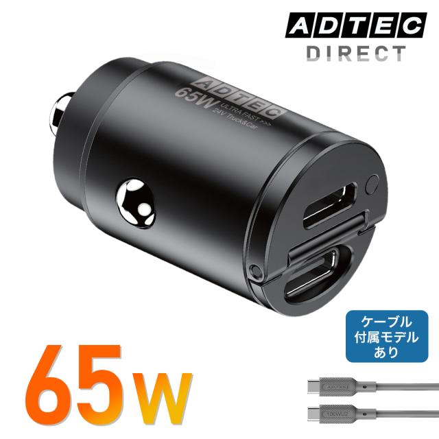 【車載PD充電器 65W】USB-C×2ポート ケーブル付属 24V車で最大65W 12V車36W対応 超小型 高出力 ノートPC・スマホ急速充電 トラック対応 日本メーカー