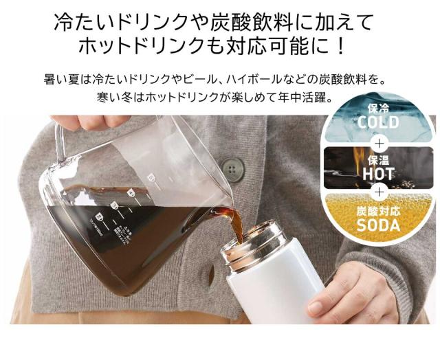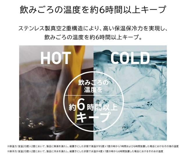 ステンレス製真空2重構造により、高い保温保冷力を実現し、飲みごろの温度を約6時間以上キープ。