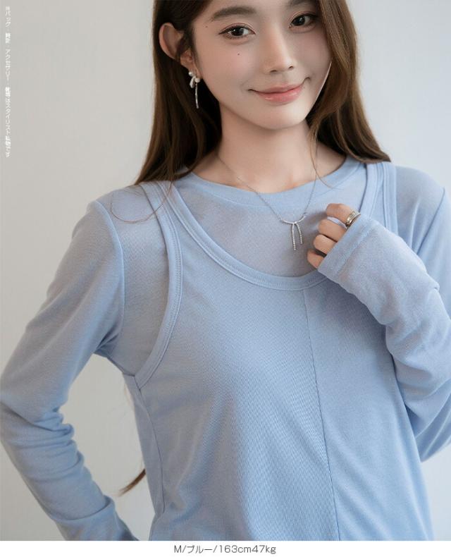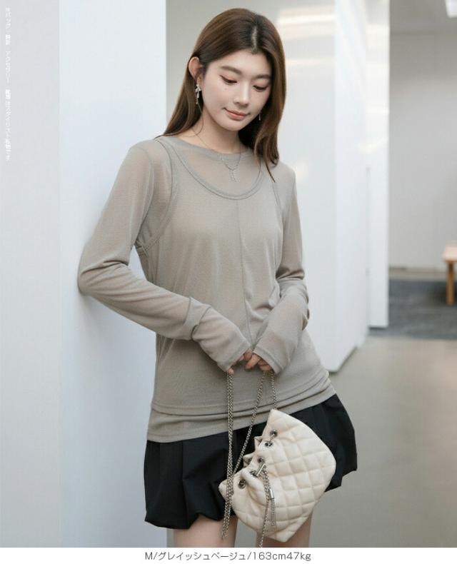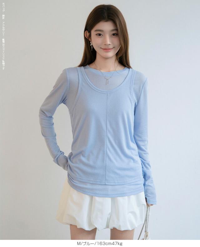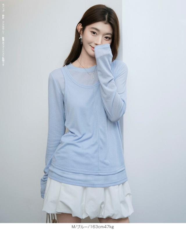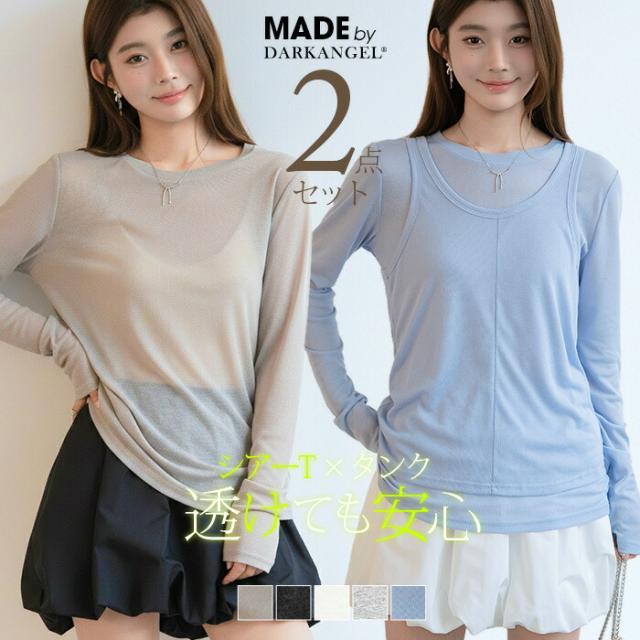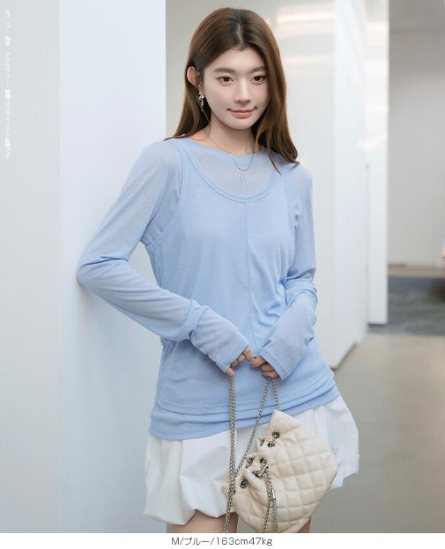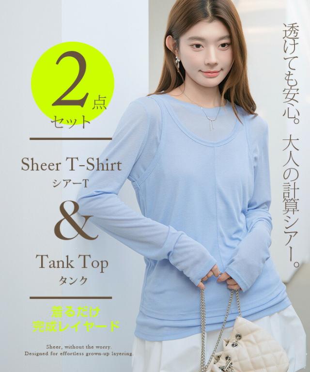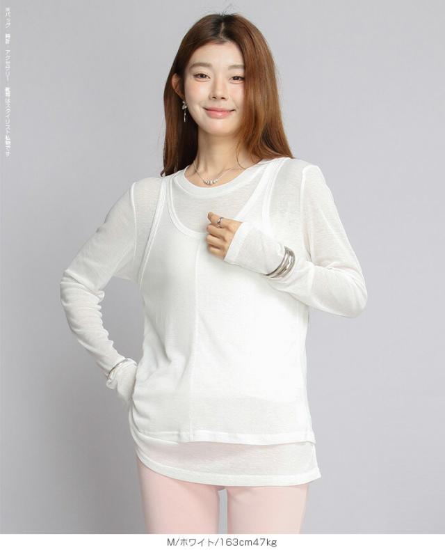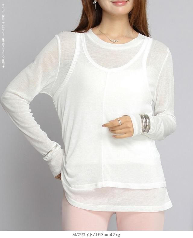 33%OFFクーポン!シアートップス レディース 2点セット 長袖 ラウンドネック カットソー タンクトップ セット レイヤード 重ね着 透け感 インナー付き 春 夏 秋 韓国風 大人カジュアル 無地 薄手 M L