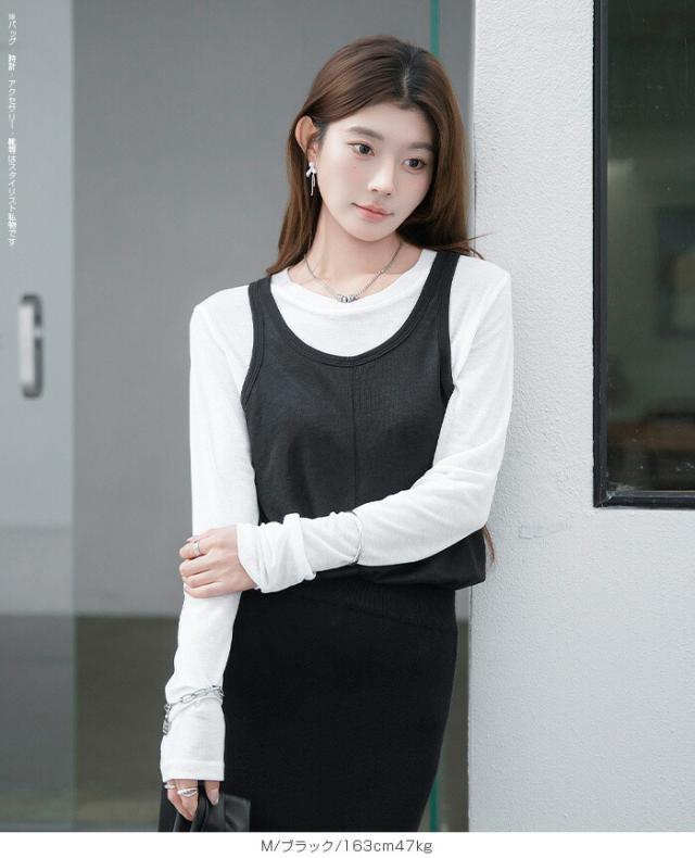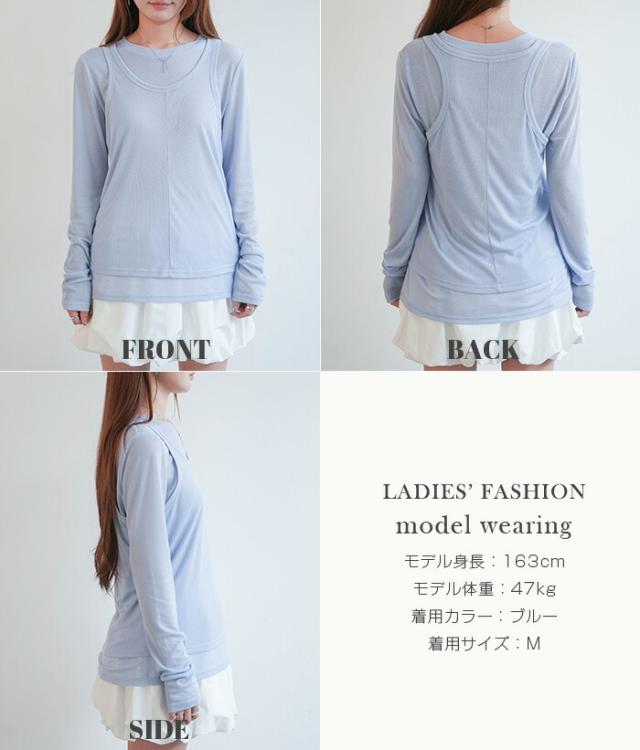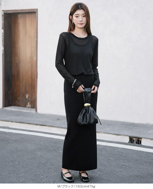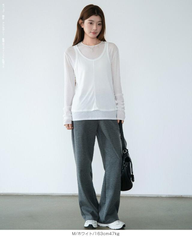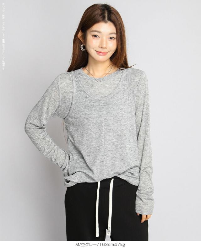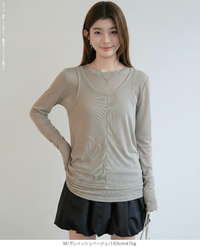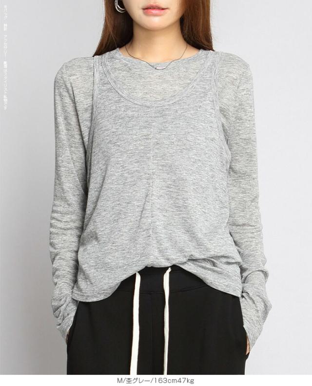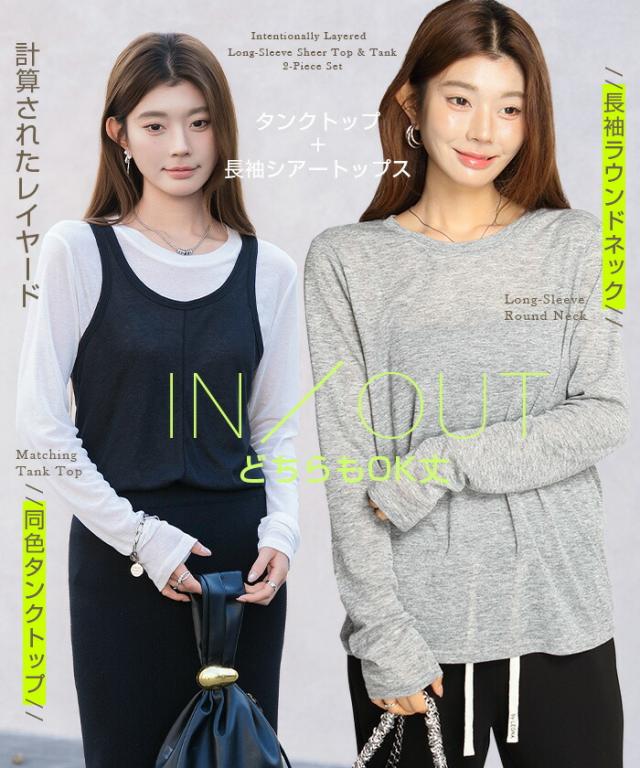 33%OFFクーポン!シアートップス レディース 2点セット 長袖 ラウンドネック カットソー タンクトップ セット レイヤード 重ね着 透け感 インナー付き 春 夏 秋 韓国風 大人カジュアル 無地 薄手 M L