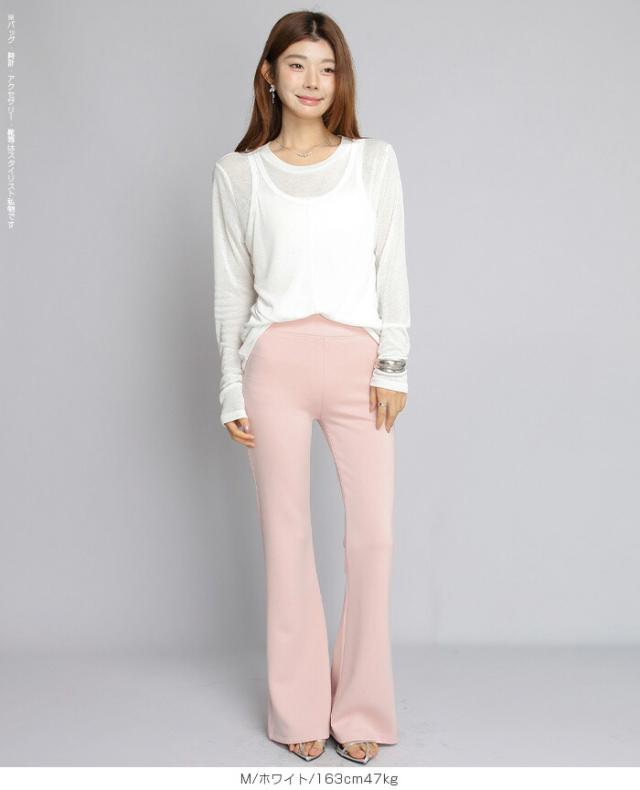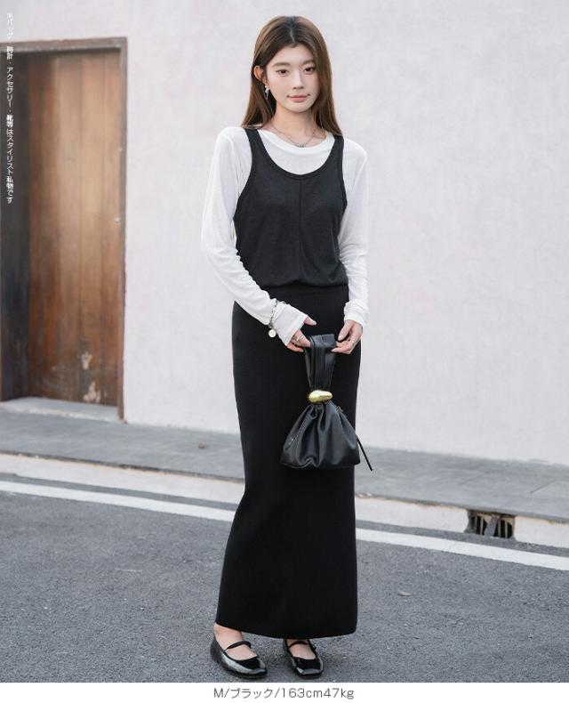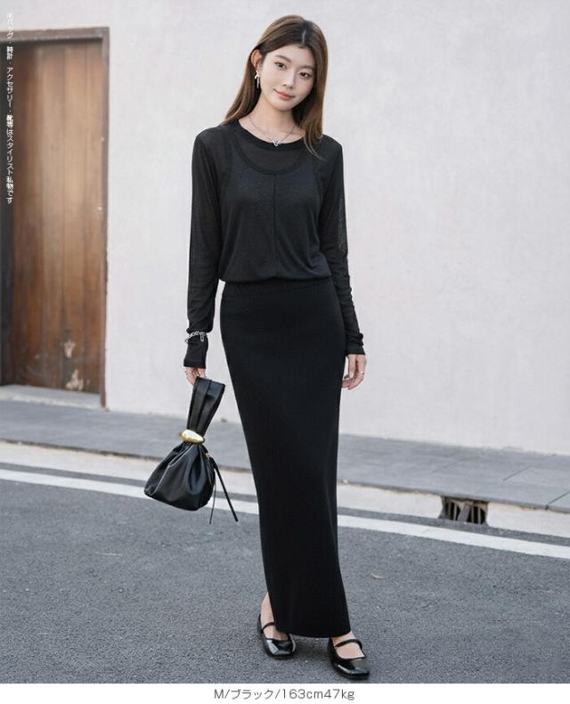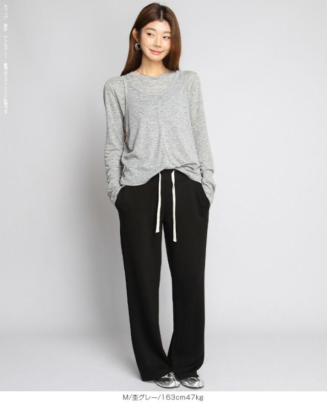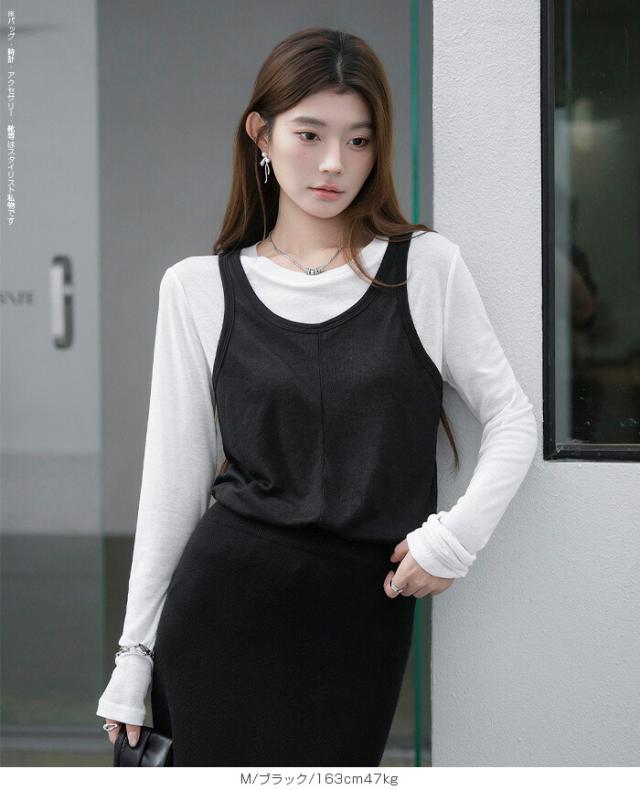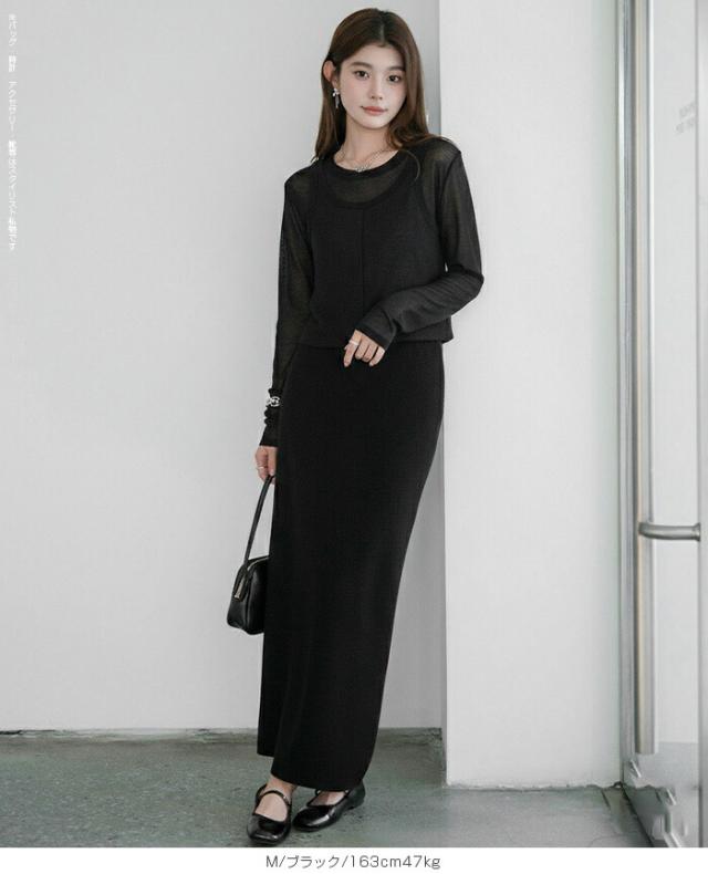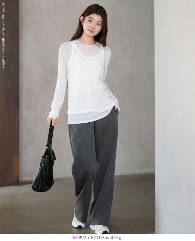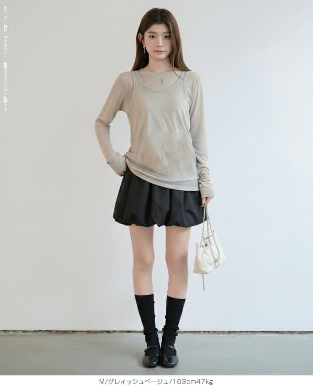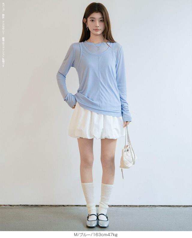 33%OFFクーポン!シアートップス レディース 2点セット 長袖 ラウンドネック カットソー タンクトップ セット レイヤード 重ね着 透け感 インナー付き 春 夏 秋 韓国風 大人カジュアル 無地 薄手 M L