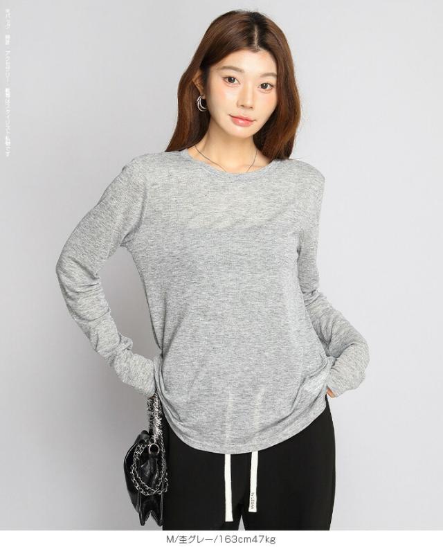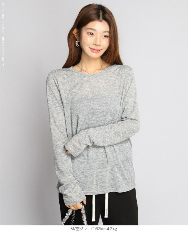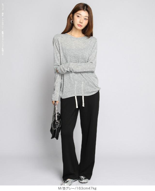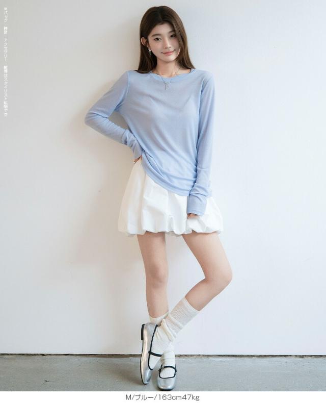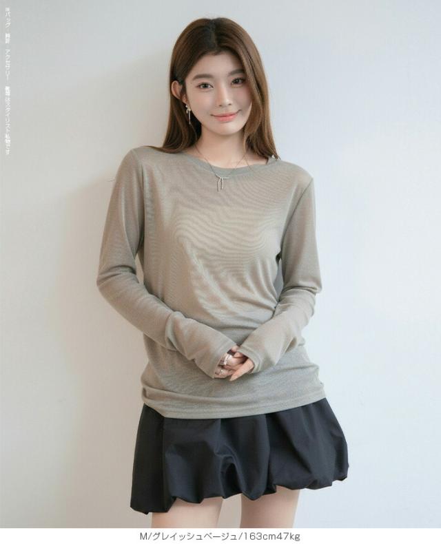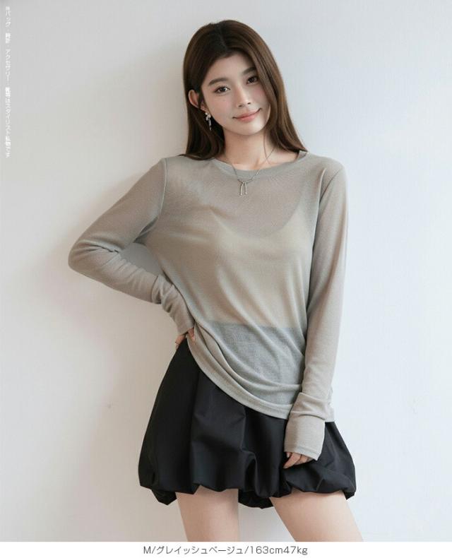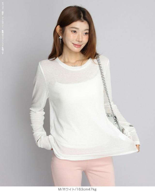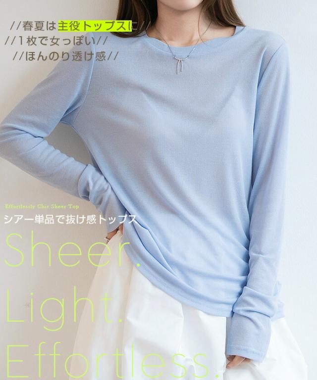 ほんのり透けるエアリーシアー素材の長袖ラウンドネックカットソーと、
