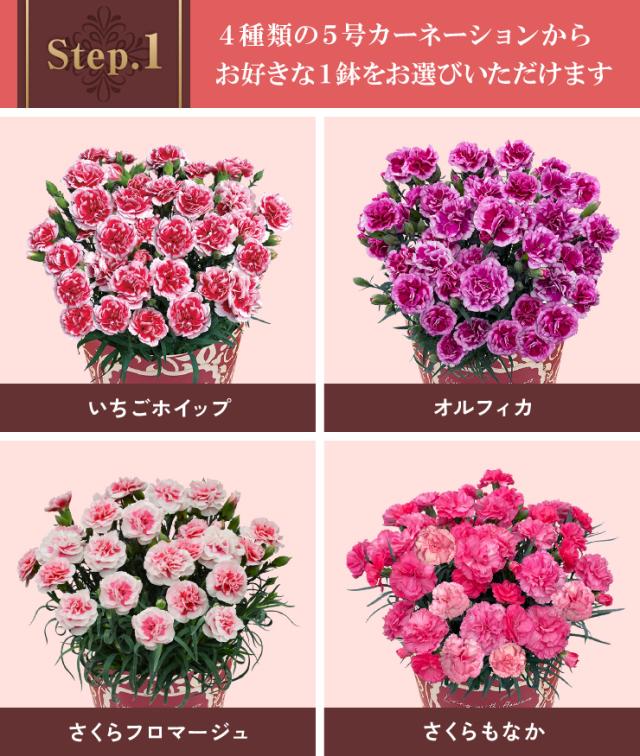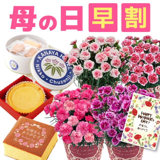 母の日 花とセット カーネーション プレゼント ギフト 花 スイーツ セット 花 鉢植え 3種から選べるお菓子 文明堂 カステラ いちごの里 苺 チーズケーキ バームクーヘン 東北〜関西 送料無料 母の日プレゼント 鉢花 花鉢