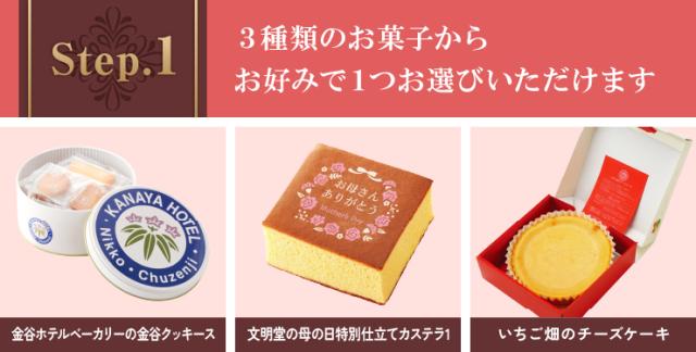 4種類から選べる花鉢、3種類から選べるお菓子、母の日メッセージ入りお手入れガイド ※母の日メッセージ入りお手入れガイドは、カーネーション・百合 アジサイ・ガーデニア・クレマチス・マダガスカルジャスミン・ブーゲンビリア・ダリア・カンパニュラなどのお花の育て方が記載された冊子タイプとなります。