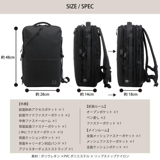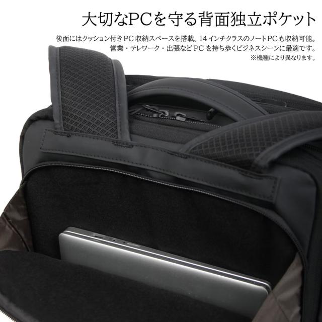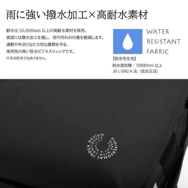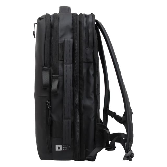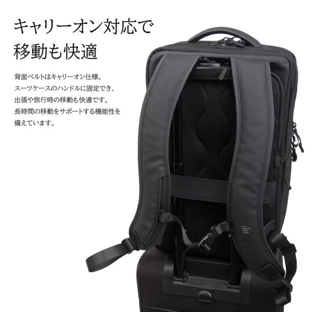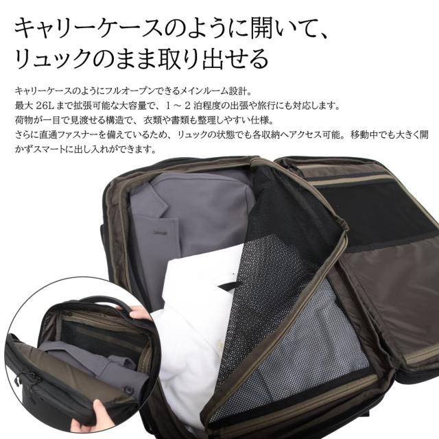耐水圧10,000mm以上の高耐水ウォータープルーフ素材でアップデート。表面には撥水加工を施し、雨や汚れの付着を防ぎます。3層構造の生地がほどよい張り感と耐久性を両立し、通勤や出張などのビジネスシーンでも安心して使える仕様に仕上げました。メインルームはキャリーバッグのように大きく開く構造で、書類はもちろん衣類も収納可能。出張や旅行にも対応する大容量設計です。ファスナー開閉によりマチ幅を調整でき、19Lから最大26Lまで容量を拡張可能。荷物の量に合わせて柔軟にお使いいただけます。二層式ファスナー仕様で収納スペースはそれぞれ独立。書類や小物を整理しやすいポケットに加え、PC対応のクッションポケットも完備しています。背負えるキャリーケースのような機能性を備え、日常の通勤から出張・旅行まで幅広いシーンで活躍するビジネスリュックです。
