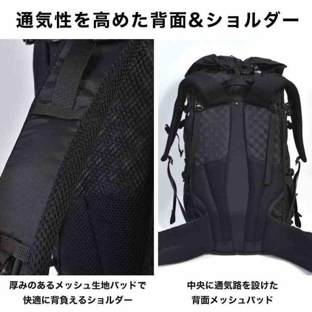 背面には通気性に優れたメッシュ素材を採用。長時間の登山でも蒸れにくく、快適な背負い心地をサポートします。