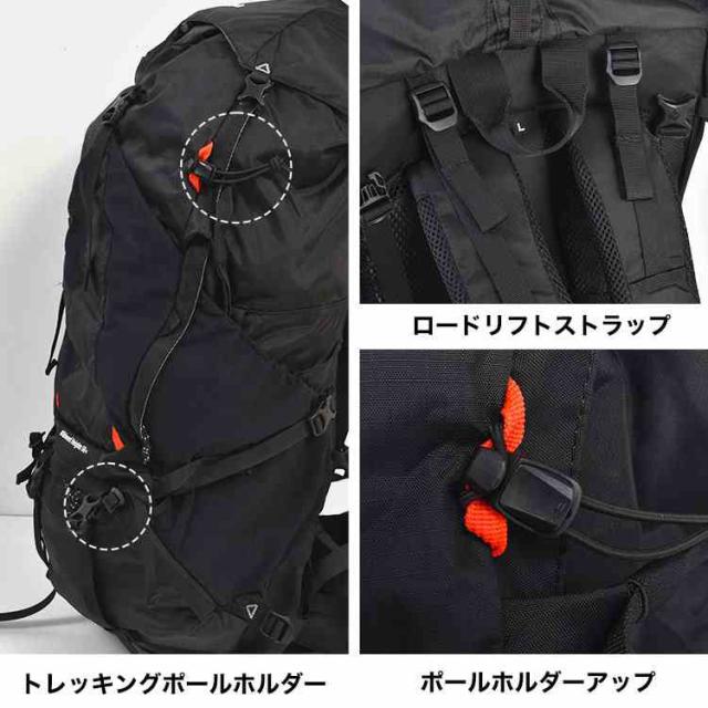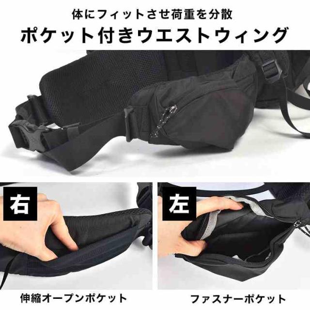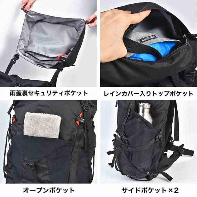 サイドポケットや各種コンプレッションベルト、ハイドレーション対応など、登山に必要な機能もしっかり装備。荷物の安定性と使いやすさを両立した設計。