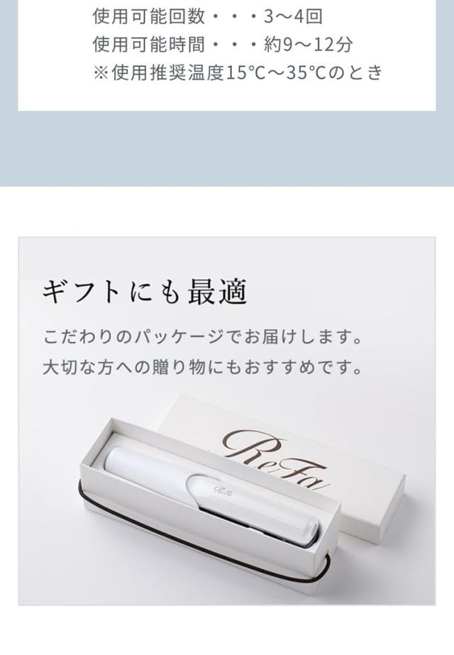 | 備考 | ・本品の性能向上のため、仕様の一部を予告なく変更する場合がありますのでご了承ください。 ・本品は、日本国内にて、企画、開発を行っています。 ・「ReFa」は、(株) MTGの登録商標です。 |